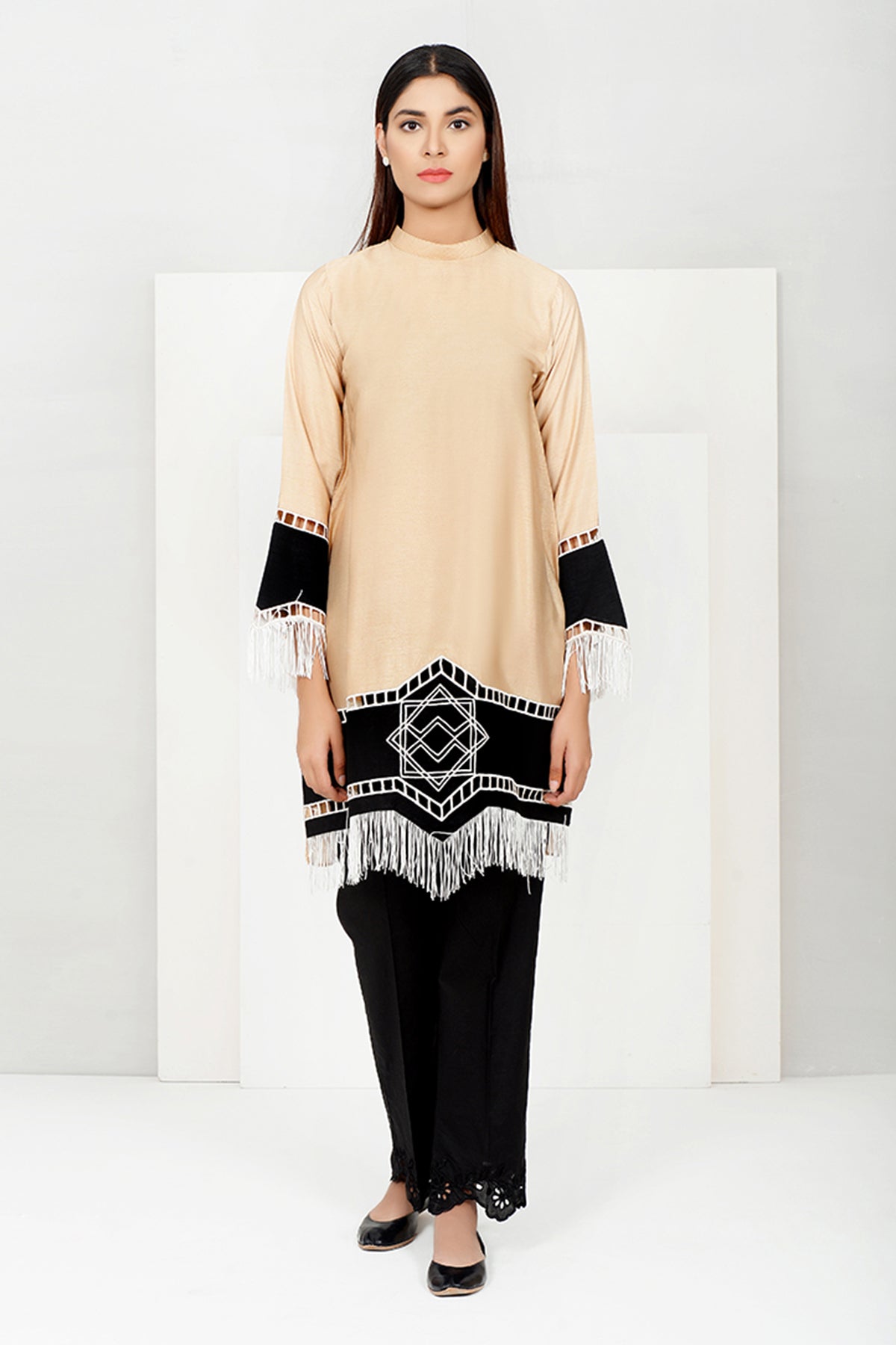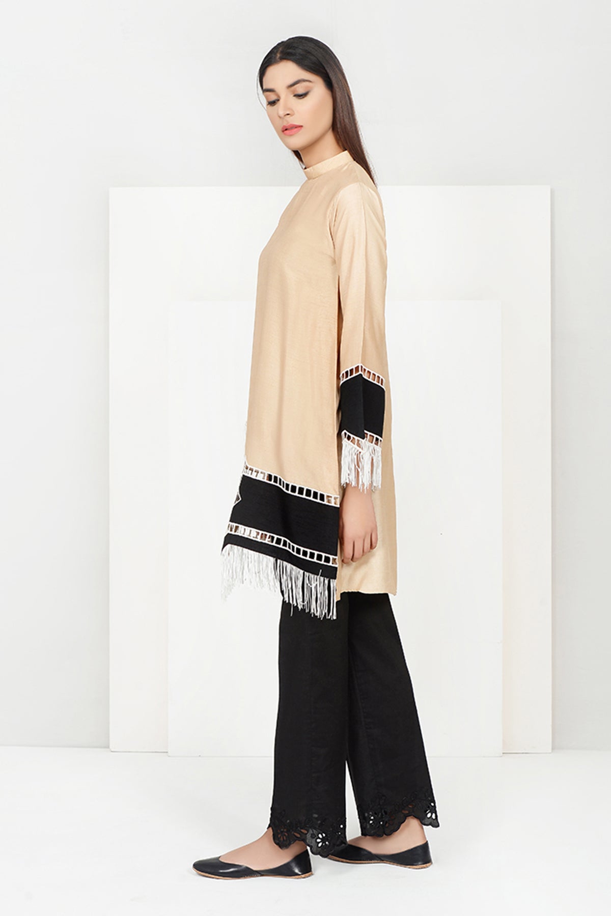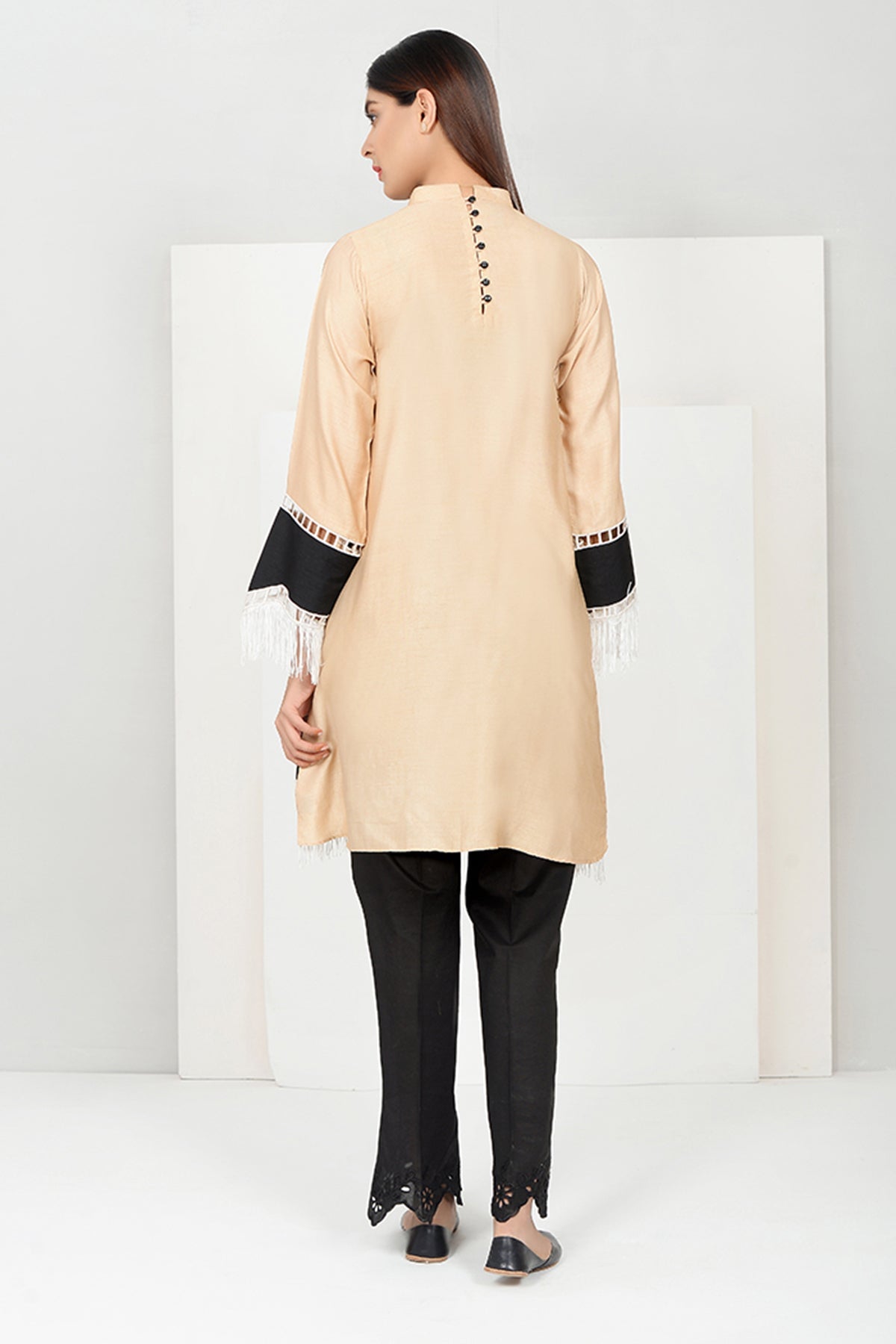 Closed Stand Ban, Full Sleeves, Embellished, Triangle Hem, Fringe Lace on Sleeves and Hem