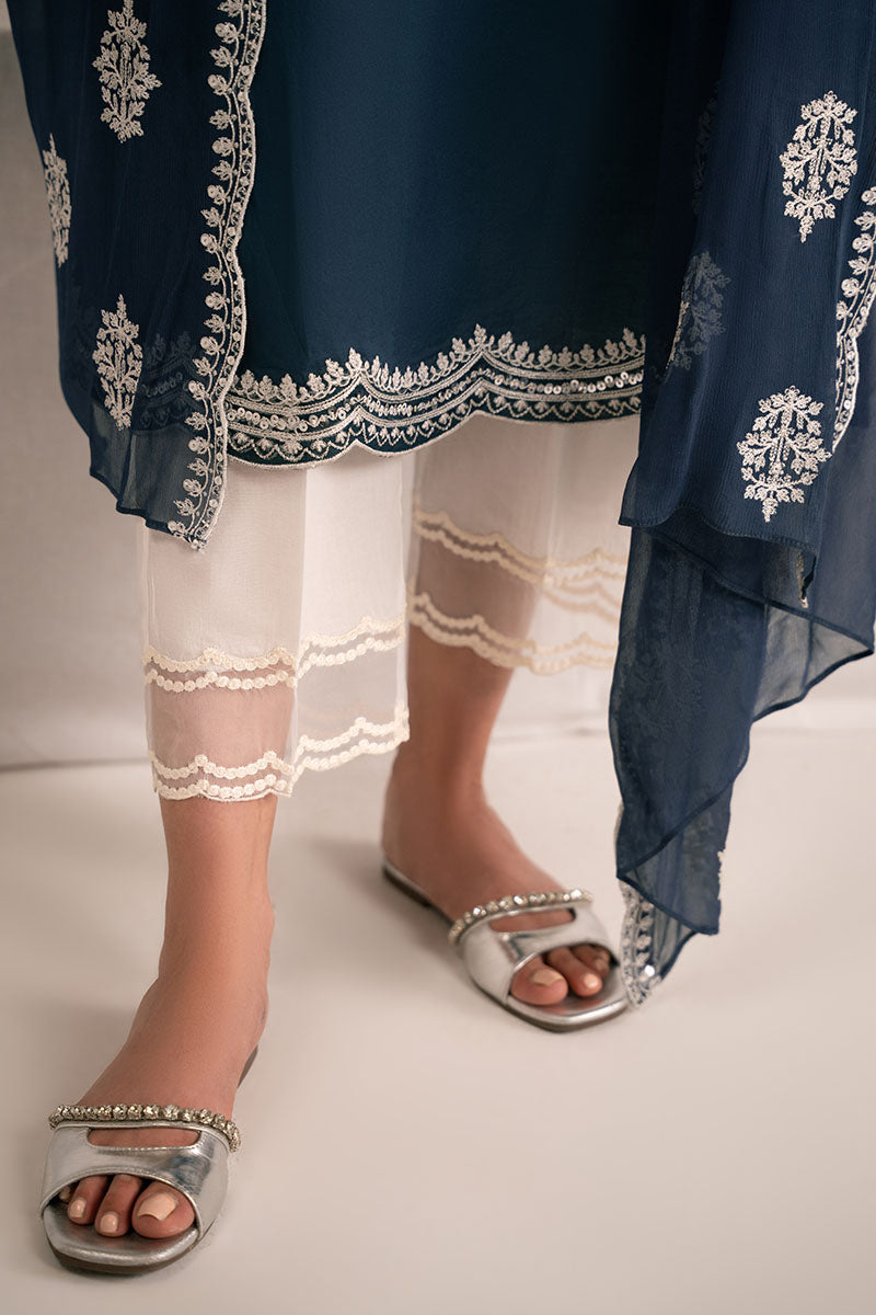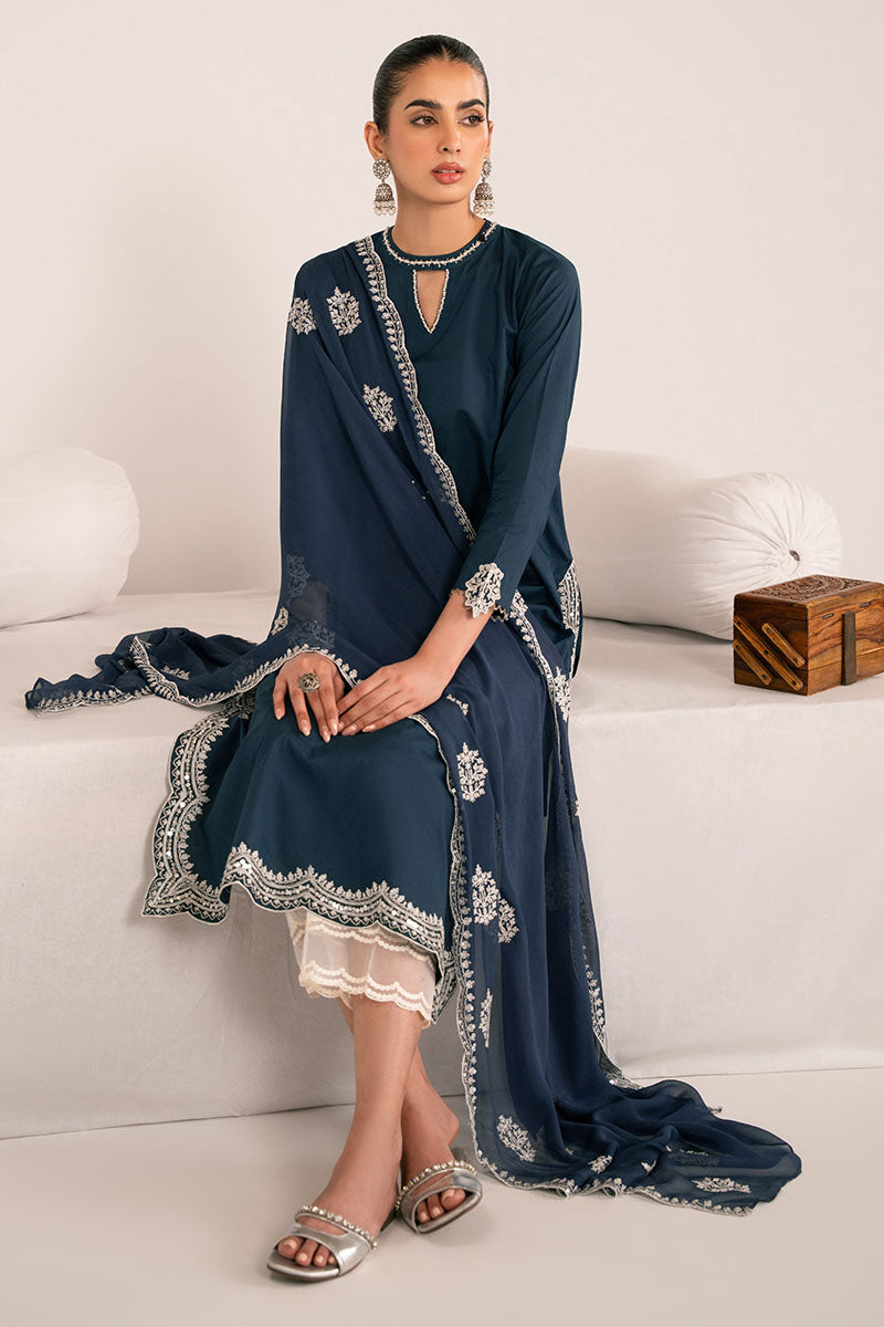 - DARK ENCHANTMENT This elegant cambric straight cut features a sophisticated front in plain dyed fabric adorned with delicate scallop embroidery along the side slits and hemline. The back maintains a clean, understated plain dyed finish for balanced proportion. The neckline showcases a flat band with a refined v-slit, embellished with intricate adda work for added dimension. Straight sleeves are elevated with motif tasseling details that catch light beautifully. Completed with a flowing chiffon dupatta featuring embroidered embellishments, this ensemble delivers timeless elegance with thoughtful craftsmanship throughout.