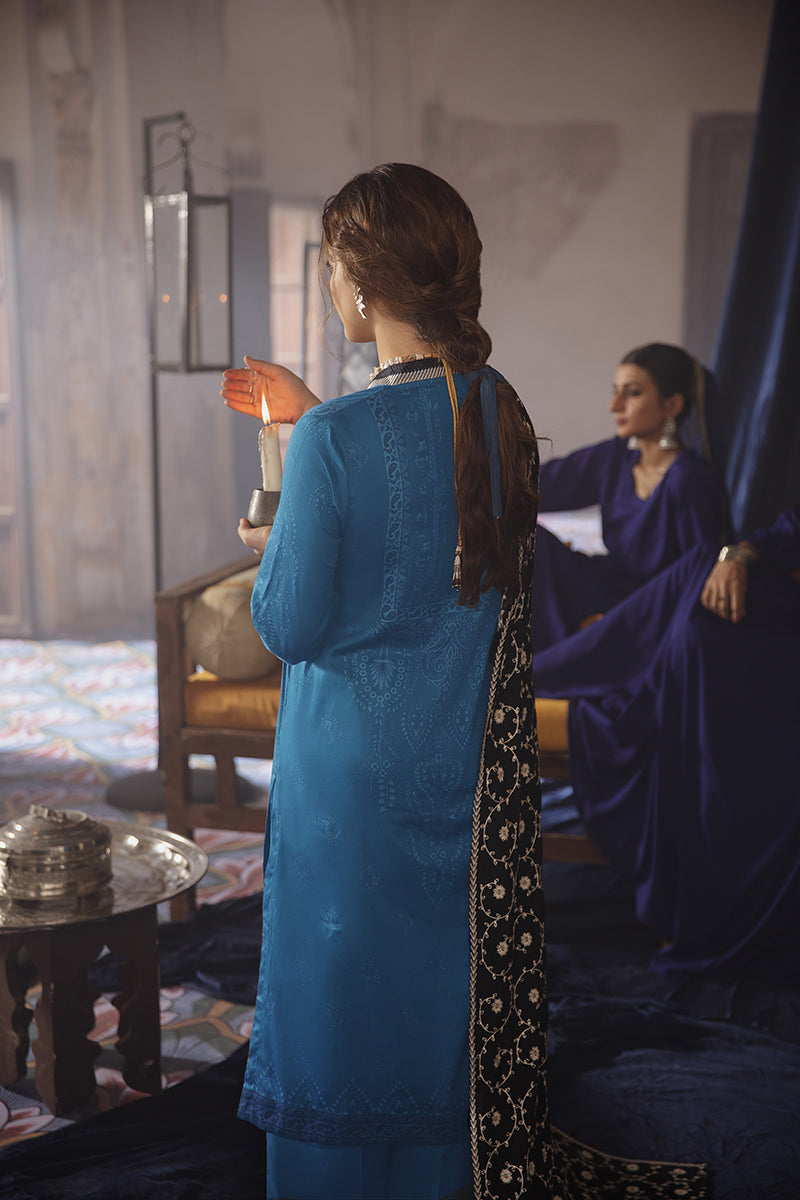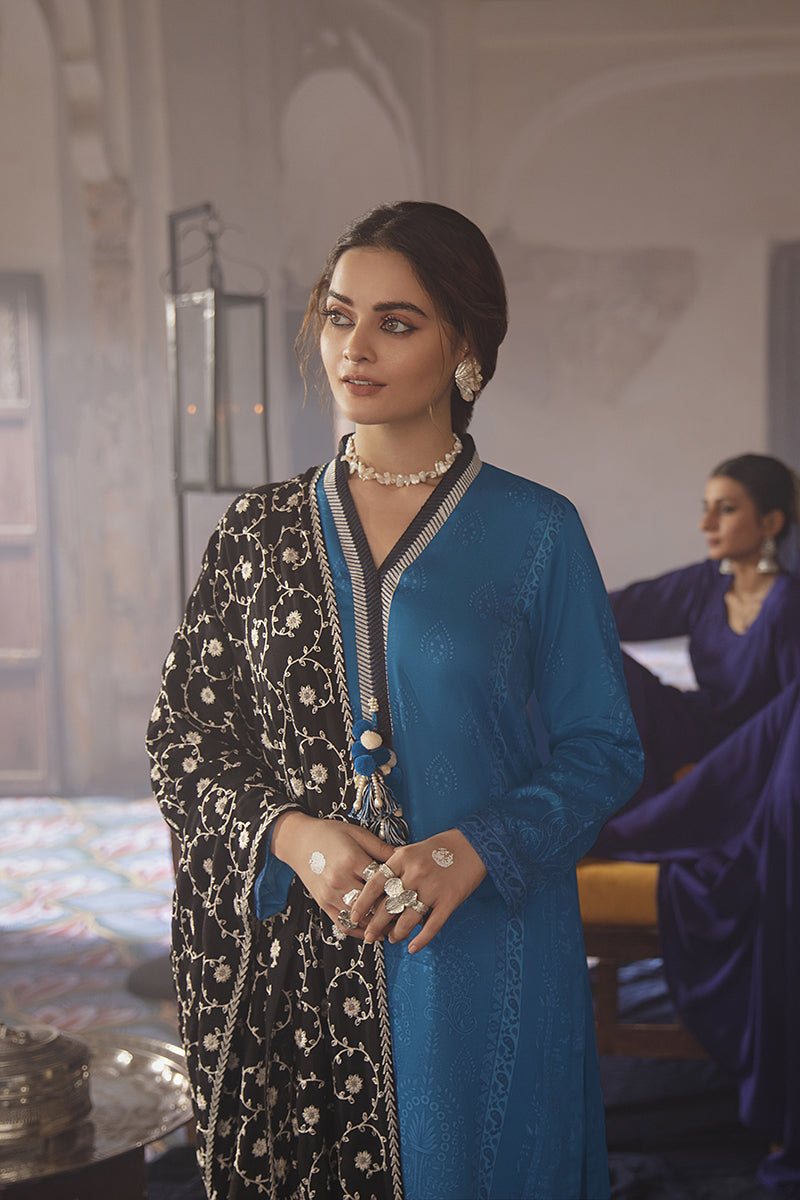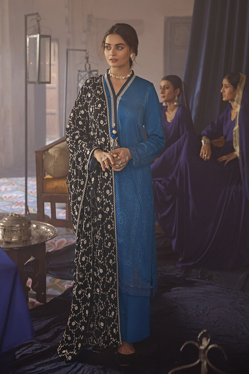 THIS GORGEOUS COTTON SATIN BLUE CANVAS WITH DIGITALLY PRINTED DARKER PATTERNS MAKES US WANT THIS IN OUR WARDROBES RIGHT NOW! THE FULLY EMBROIDERED MONOCHROME DUPATTA IS DEFINITELY ADDING THAT ROYAL TOUCH TO THE OVERALL LOOK!
