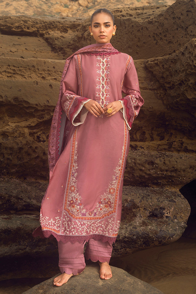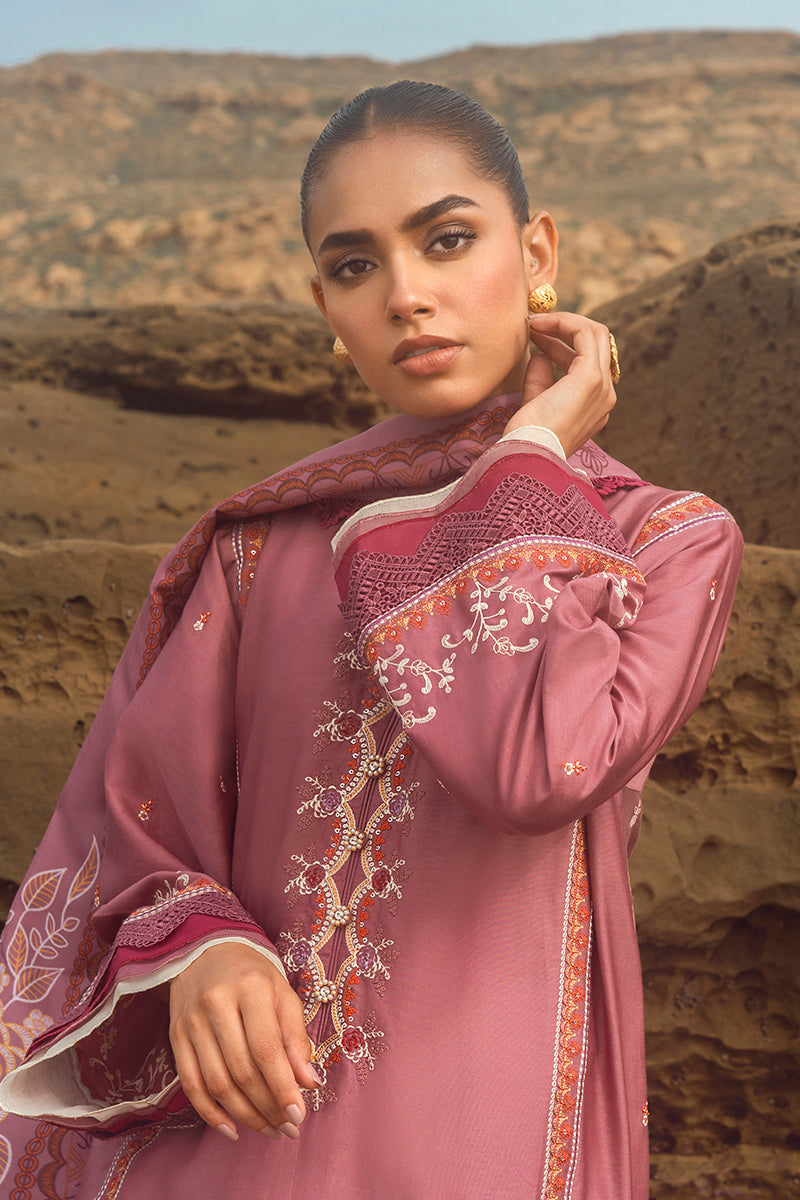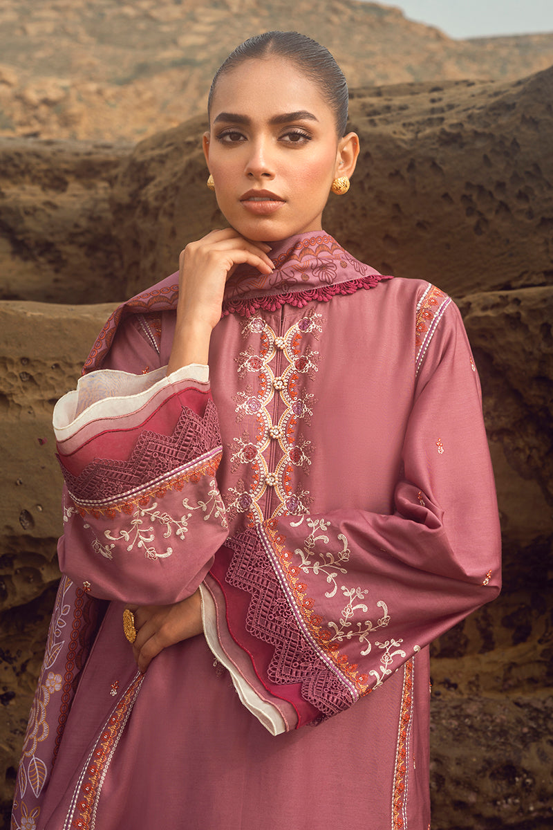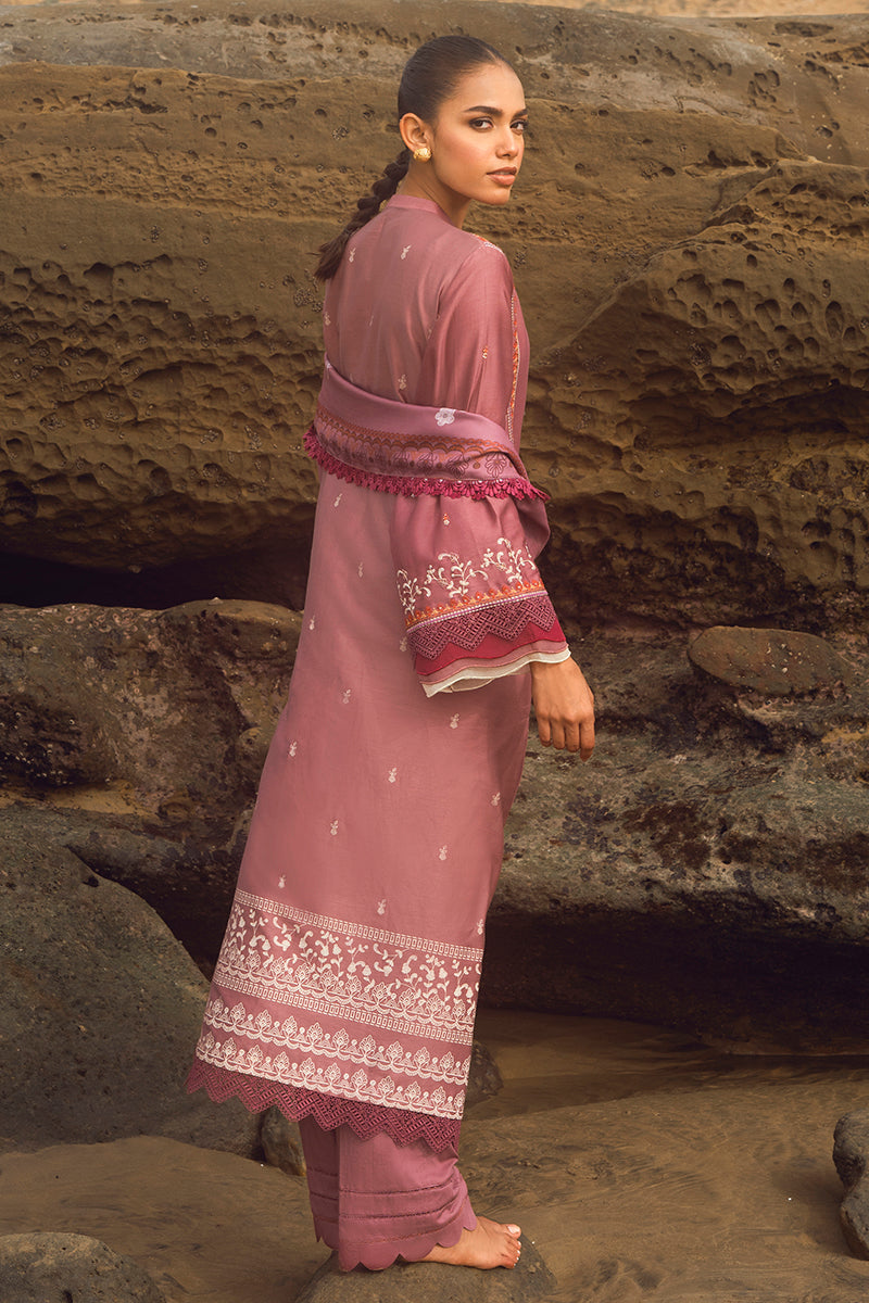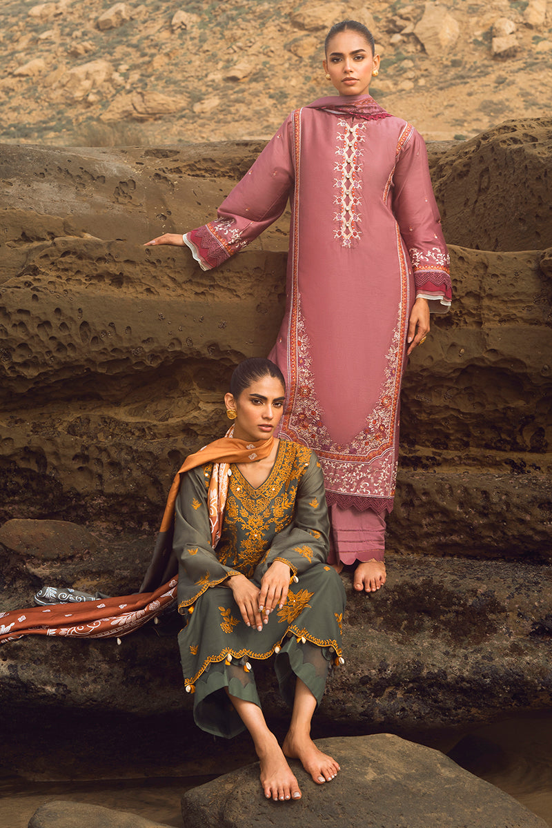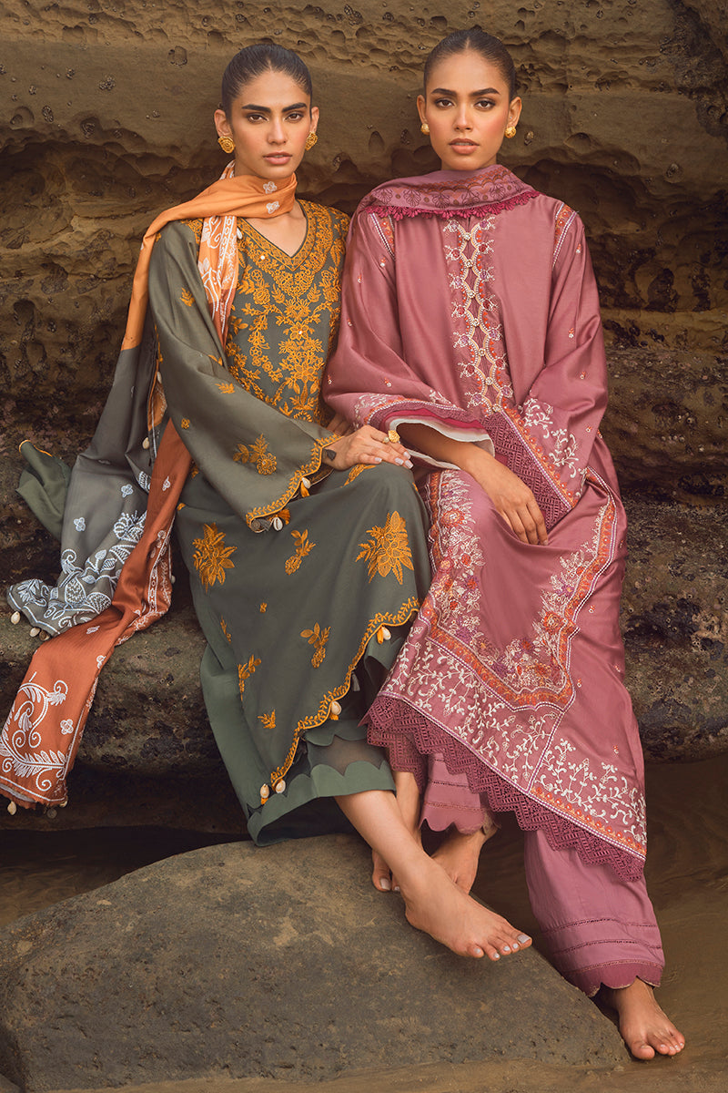 - ELINOR BLAZE is an exquisite ensemble crafted from 100% cotton satin and dyed cambric. The shirt front and sleeves are embroidered, and the back is paste printed. The shawl is digitally printed, ensuring a vibrant look and feel. An ideal choice for special occasions, ELINOR BLAZE combines sophistication and style.