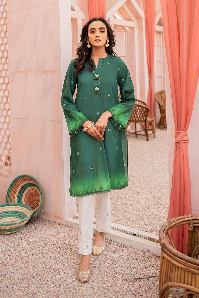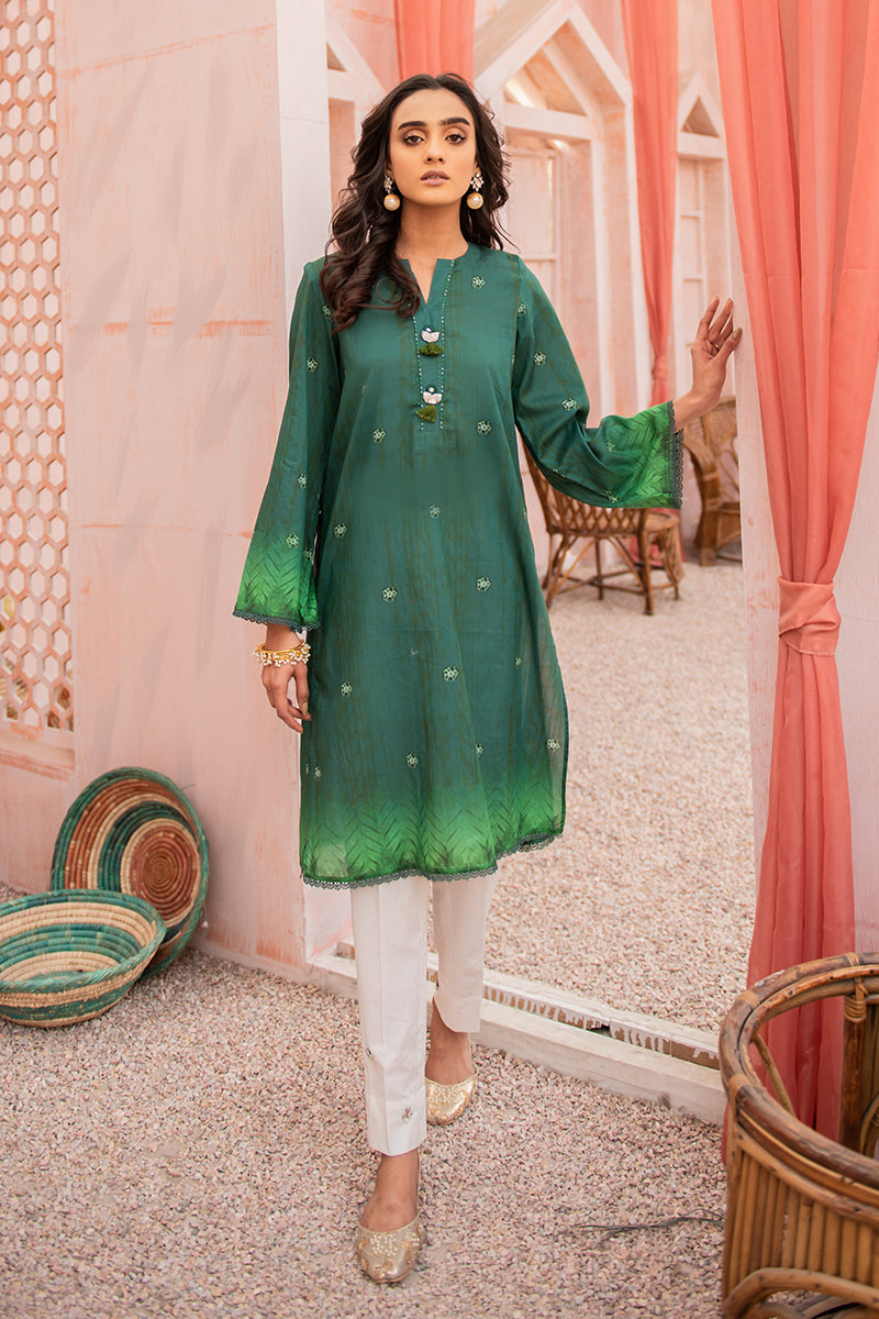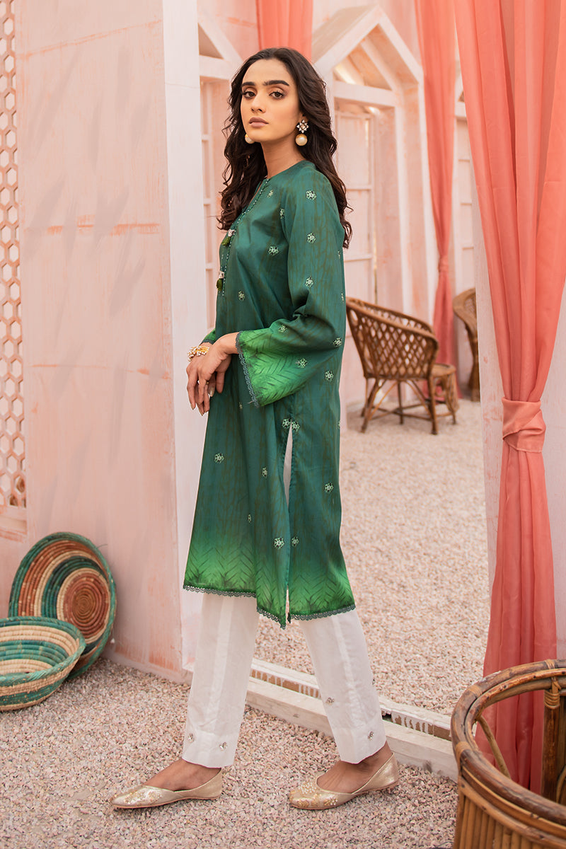 - Paint your emerald dreams to reality with this two toned digital printed lawn kurta styled best with subtle makeup and gold accessories.