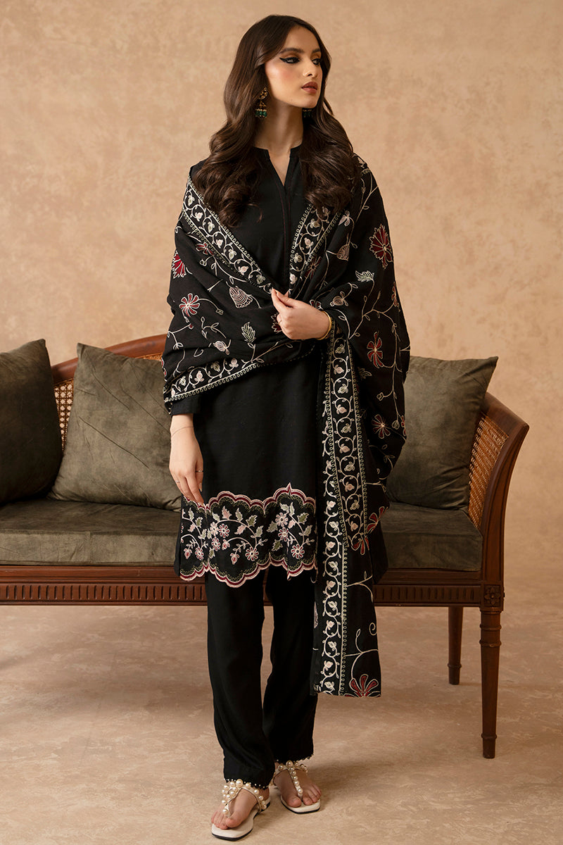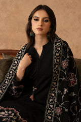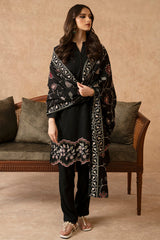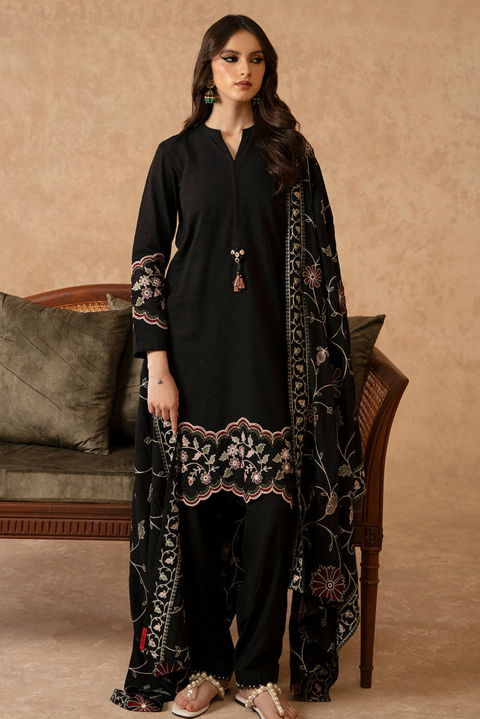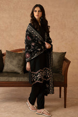 - Experience the ethereal beauty of our RAVE-2 PIECE KHADDAR EMBROIDERED SUIT. This stylish medium length a-line shirt, made from high-quality khaddar, features a plain black front with an elegant embroidered border. The detailed embroidered neckline with tassel adds a touch of sophistication, while the staple woolen embroidered dupatta completes the look. Perfect for any occasion, bring out your inner fashionista with this stunning suit.