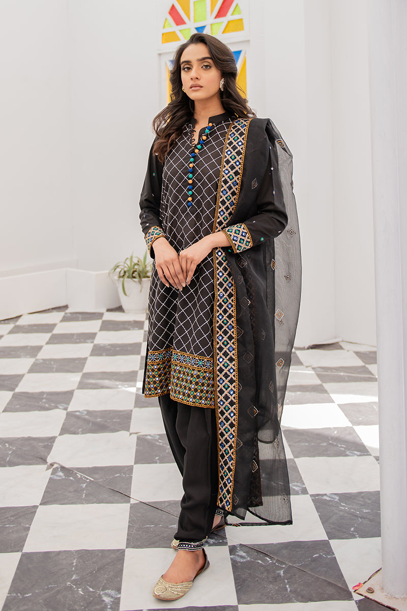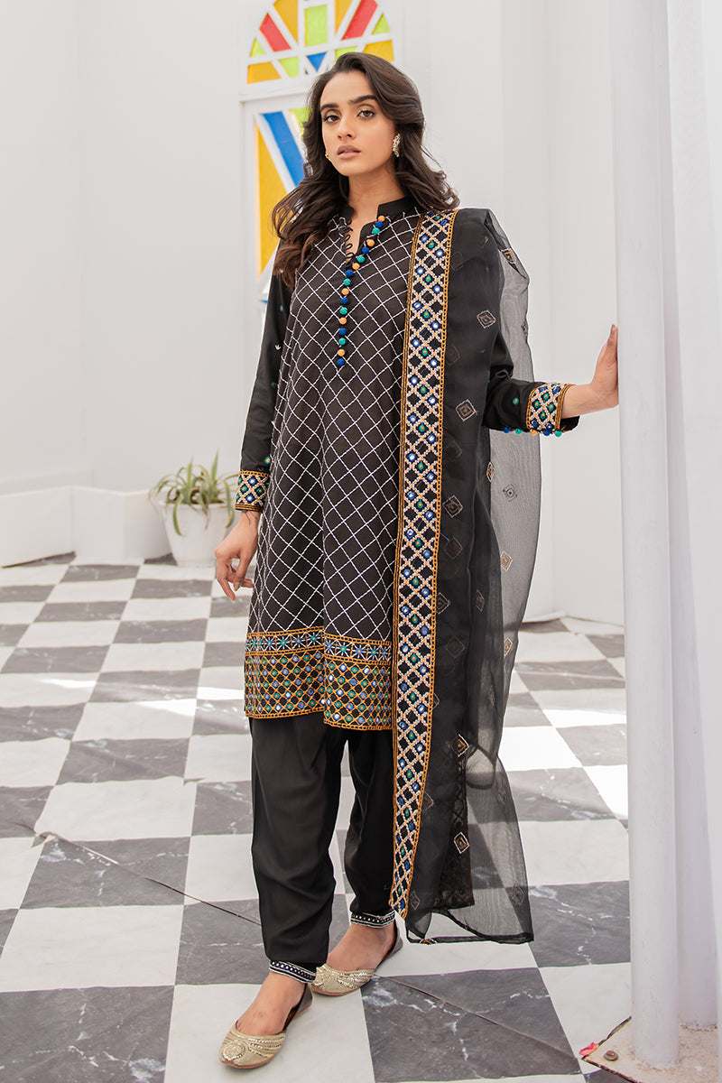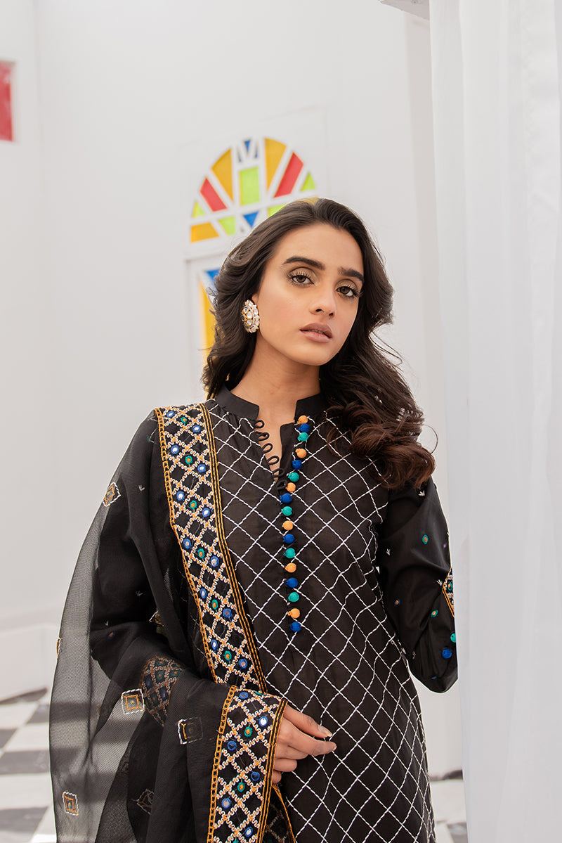 - Ethnic Meadow features a front embroidered band neckline Lawn shirt with multi colored buttons and faux mirror embroidered fitted sleeves and borders. Complimenting the black kurta is an embroidered net dupatta on net fabric, styled best with black tapered shalwar and chunky jewelry.