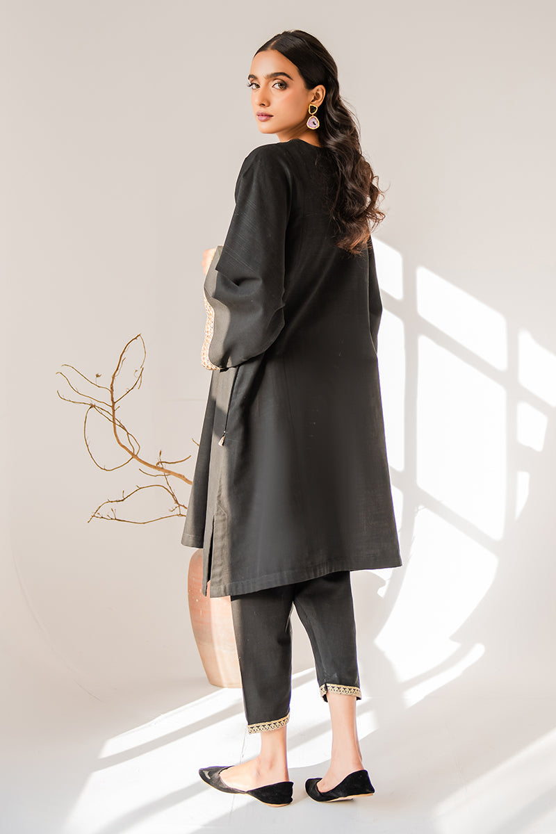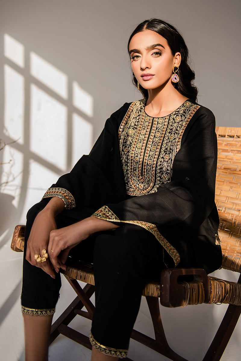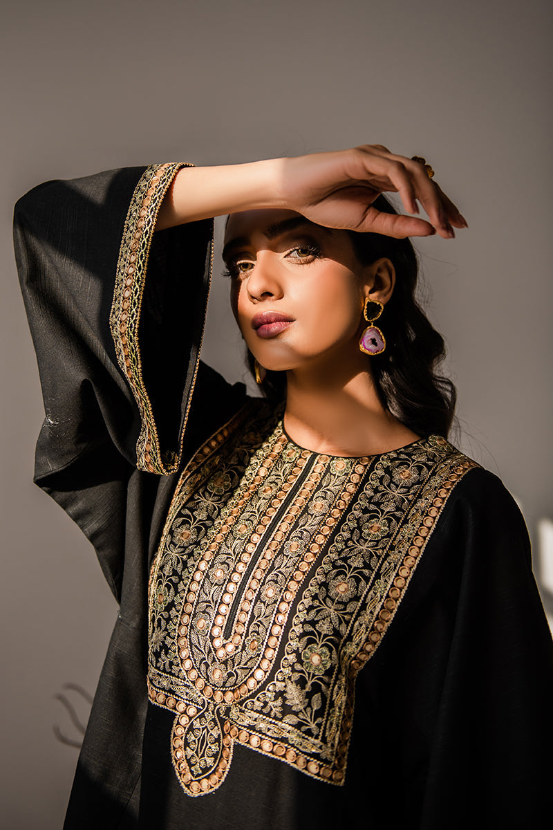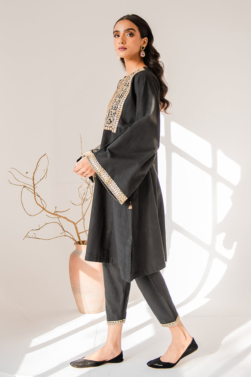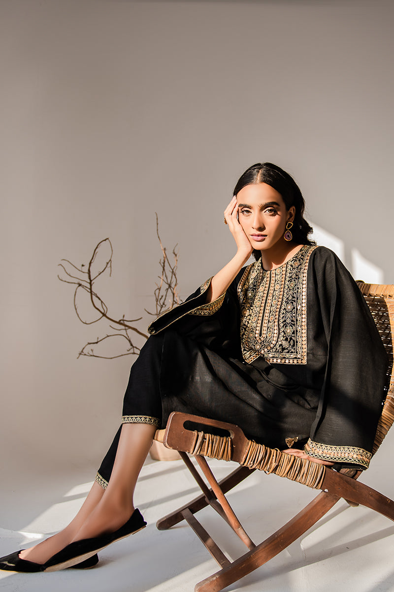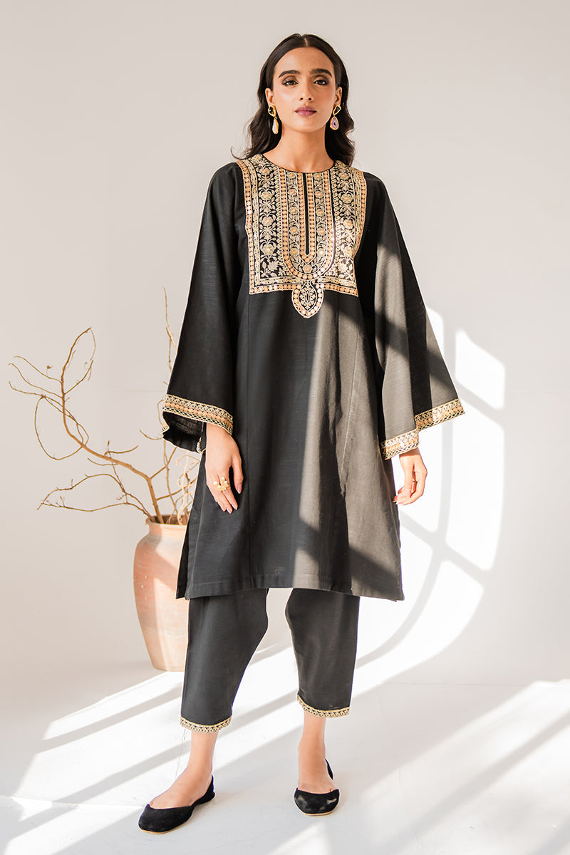- Winter linen kurta with front faux mirror embroidery and sequin embellishment paired with a tapered embroidered shalwar. Ethnic Tribe can be styled with slick back hair and gold jewelry.