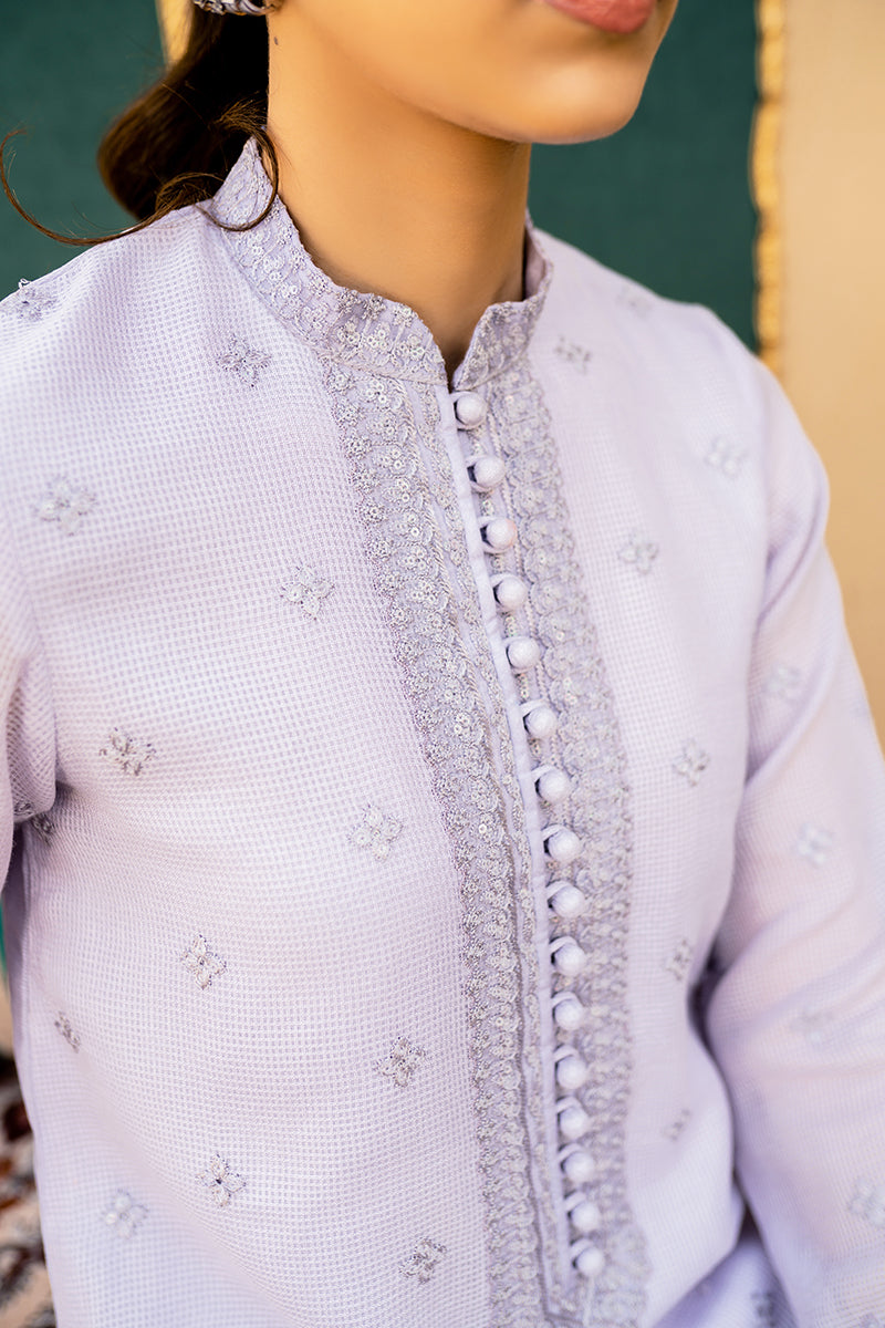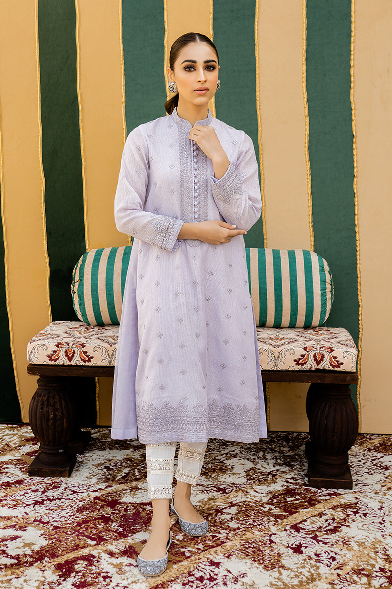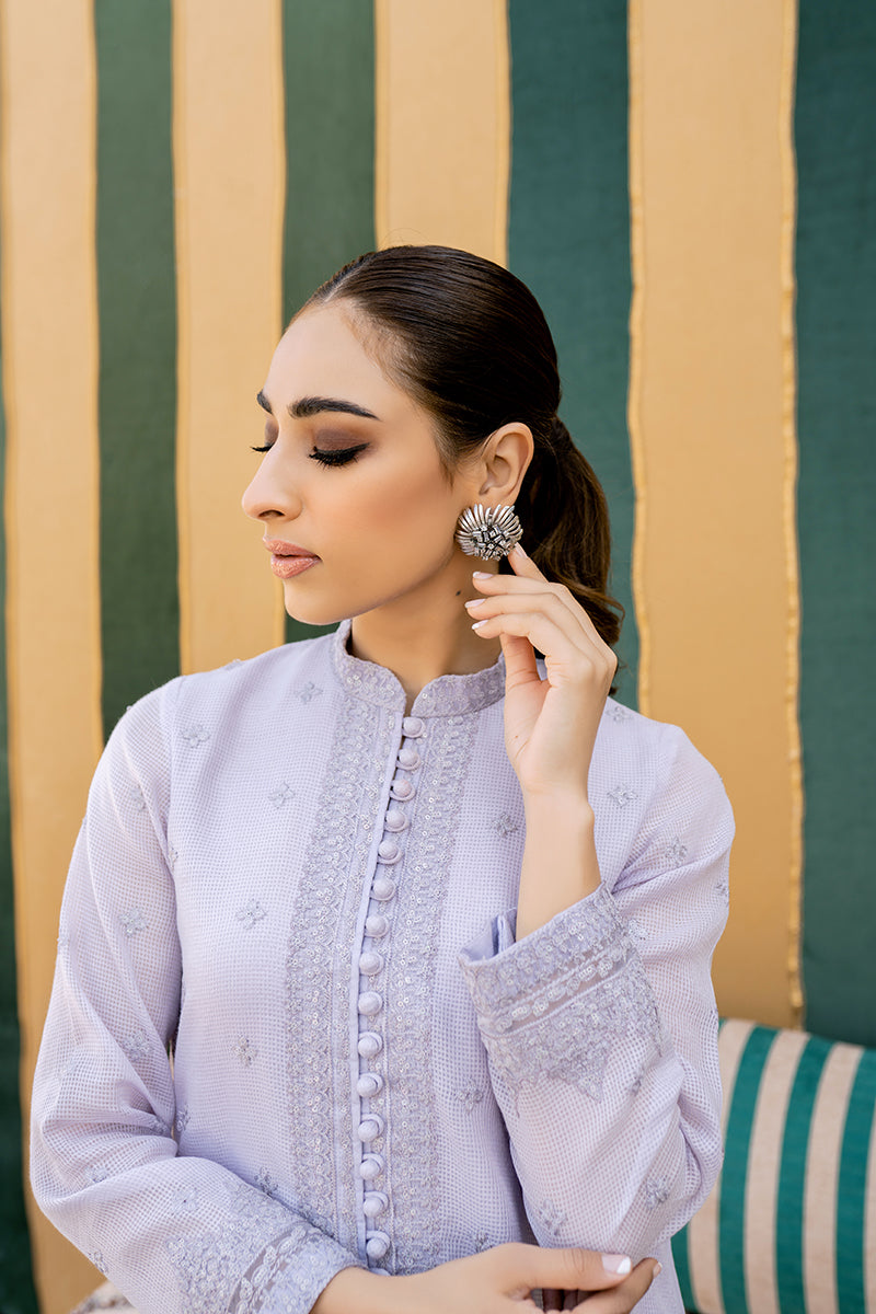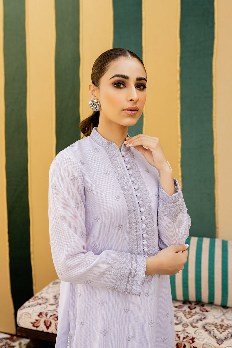 Fauna is a sublime luxury pret embellished with details to die for. Featuring a stand ban collar with loop buttons on dreamy lilac base, A-line net kurta pairs best with embellished cigarette pants.