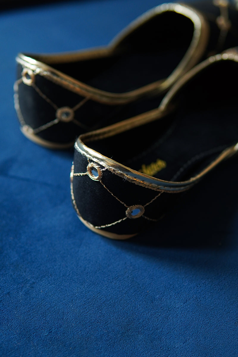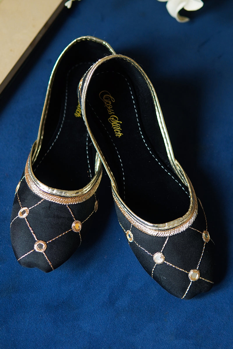 - This shiny black khussa is embroidered in golden thread and faux mirror embellishments to make it look perfect with your festive looks
