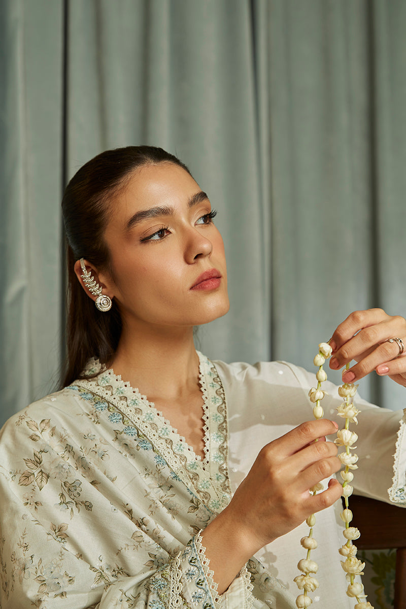 The FLORET HAZE collection offers an elegant, refined look for any occasion. Crafted with a dyed embroidered cambric shirt front and sleeves, a dyed cambric back, and a 60" embroidered patti for the shirt, this stylish ensemble is completed with a dyed cambric trouser and a lawn digital printed and embroidered dupatta. Enjoy a stylish and sophisticated look with the FLORET HAZE collection.