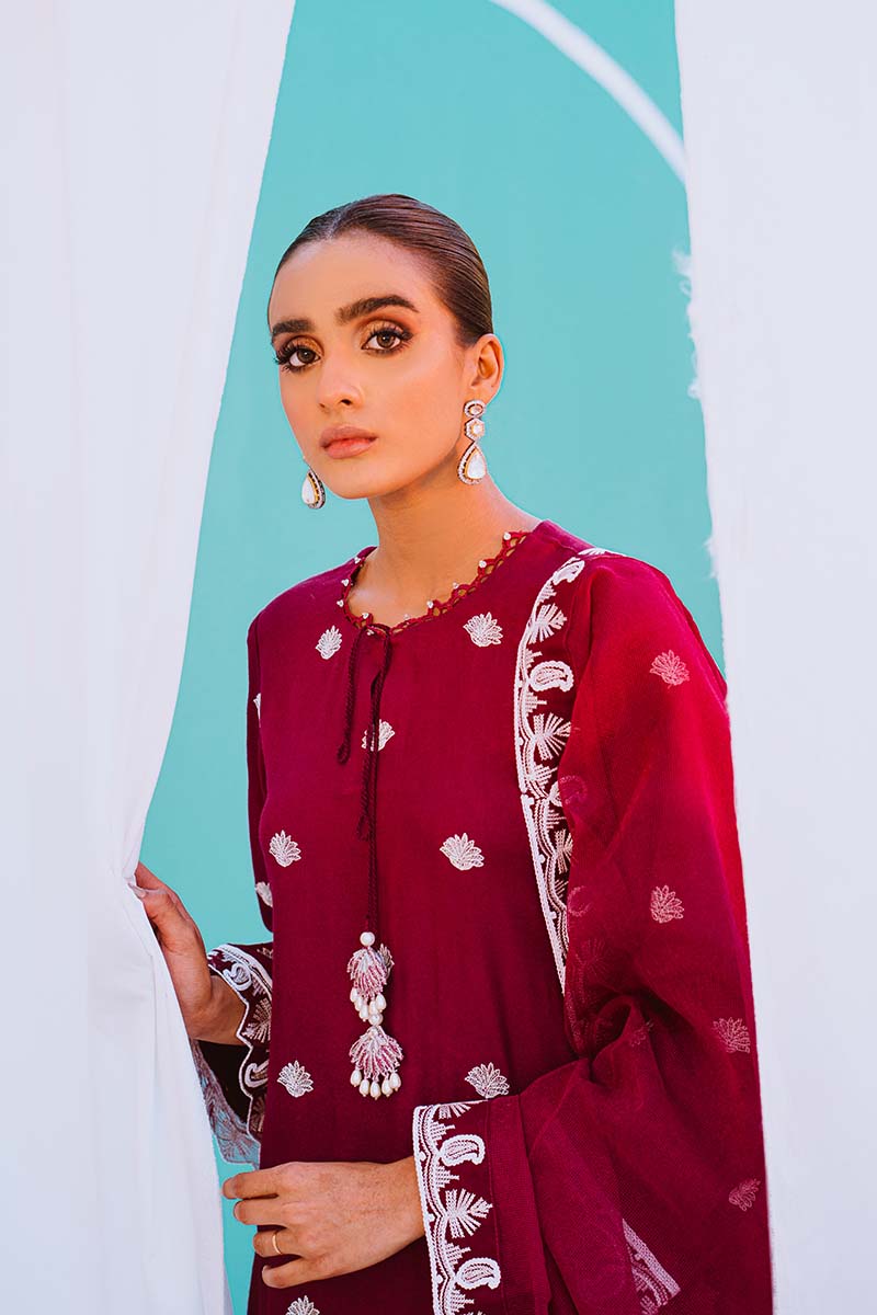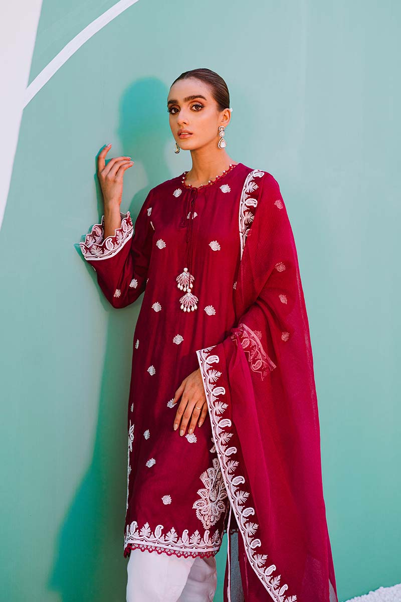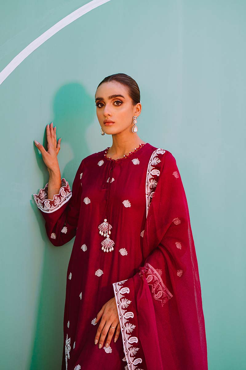 Exquisitely Embroidered Marina Shirt Paired with an Embroidered Net Dupatta. Embellished Cigarette Pants And a Classic Bun Compliment the Outfit