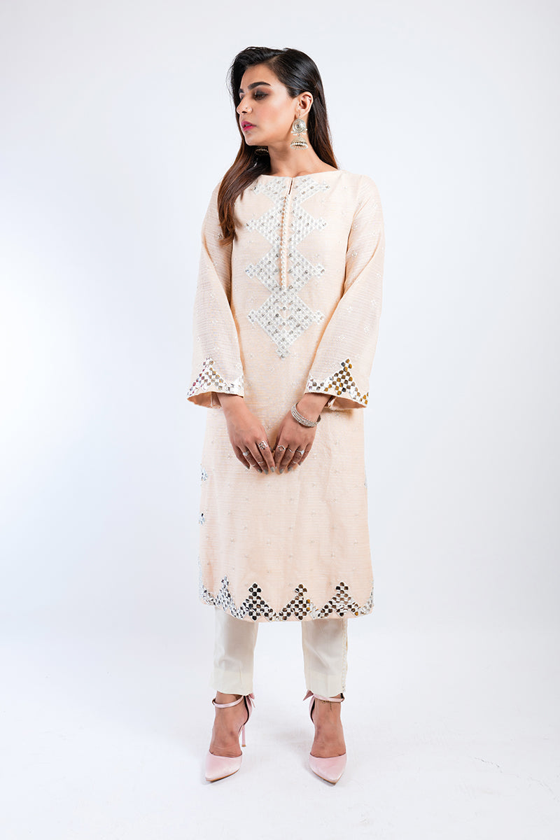 Refined Geometric Blush is a Style Revelation in Itself, Divulging a Symmetrical Pattern on Neckline, Cuffs, and Border. Matching it with a White or Cream Bottom, High Heels and Silver Jhumkas gives out a Modish Impression.
