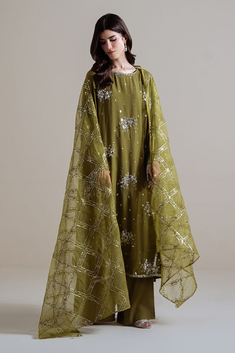 Elevate your wardrobe with the Gleam Luxe 3PC Silk Embroidered Suit, a masterpiece of refined craftsmanship. The shirt features exquisite silk embroidery adorning the front, back, and sleeves, complemented by 200 inches of ornate embroidered patti along the front, back, and sides, with an additional 40 inches gracing the sleeves. The ensemble includes a luxuriously dyed silk trouser that provides a sophisticated foundation, paired with an ethereal organza dupatta embellished with delicate embroidery. This three-piece collection represents the pinnacle of traditional elegance, designed for those who appreciate meticulous detail and premium materials.
