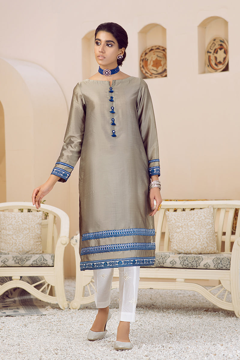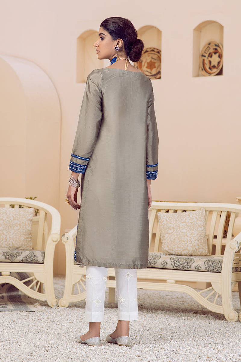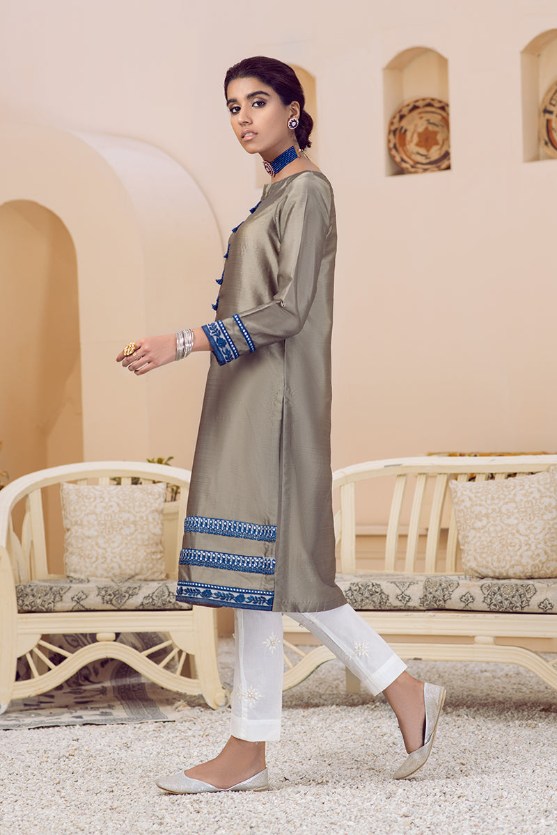 The Classic Take on a Solid Silk Kurta with Lapiz Blue Embellishments make it a One of a Kind. To add an Oomph Factor to your look, pair with a Jamawar Bottom or Embroidered White Cigarette Pants for a Modern Look