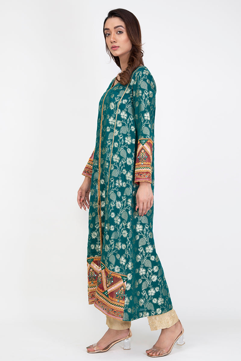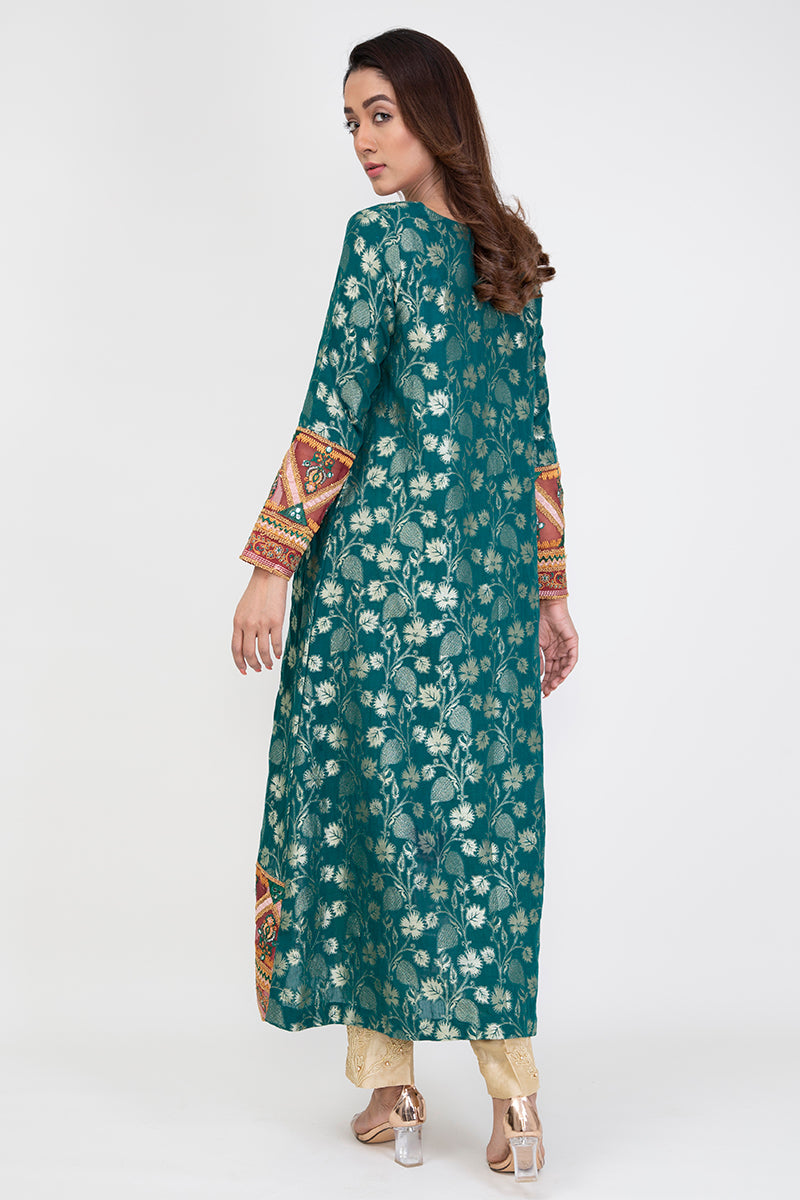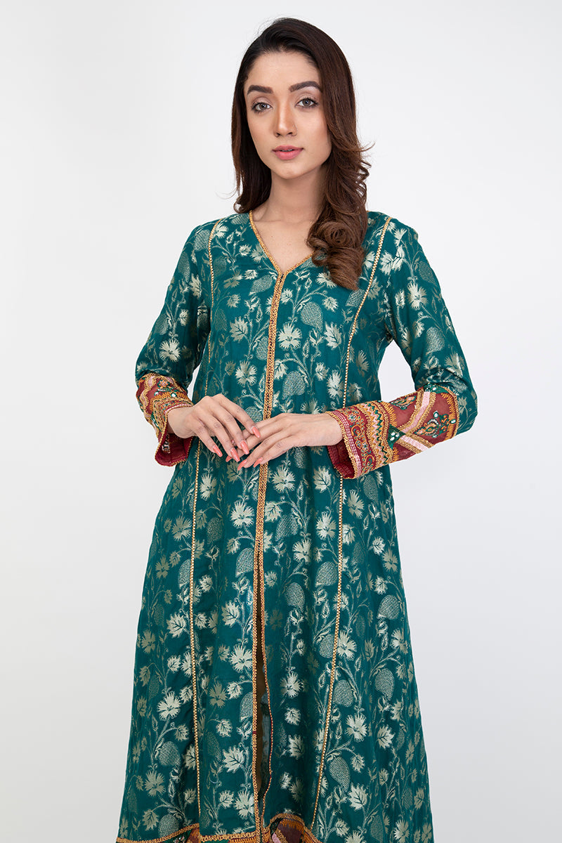Frock style top in this jacquard with a net border and sleeves is an overall wow to go with a churidar and an open hairdo.