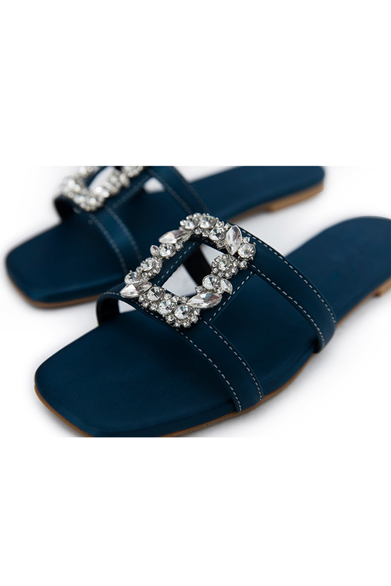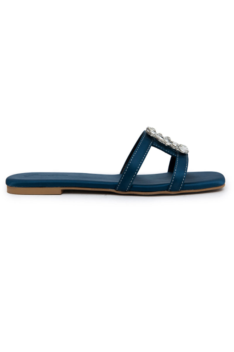 THIS STUNNING SATIN SLIDES FEATURES A TRADITIONAL BLUE HUE. ITS FRONT CRYSTAL TRIM MAKES IT IDEAL FOR A FORMAL EVENING LOOK.