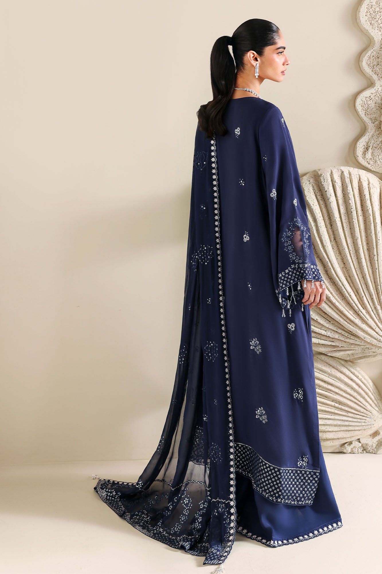 Elevate your wardrobe with this exquisite three-piece silk embroidered suit. The shirt features intricate silk embroidery across the front, back, and sleeves, complemented by an 80-inch embroidered patti adorning the front and back hem. The coordinating silk-dyed trouser showcases a refined 60-inch embroidered patti detail. Complete the ensemble with a flowing chiffon embroidered dupatta, finished with two decorative embroidered patches. Each element is meticulously crafted to deliver sophisticated elegance and timeless appeal. - NOTE: Actual product color may slightly vary from the images due to lighting and photography effects.