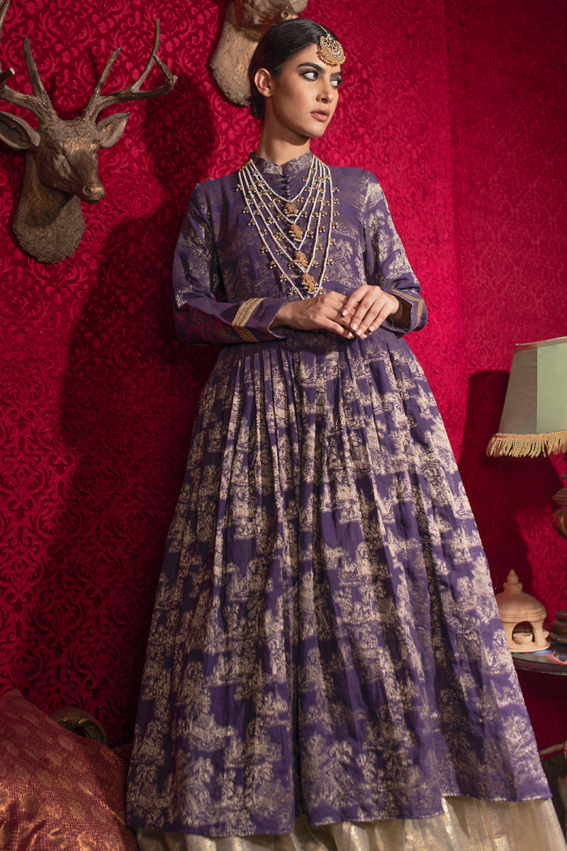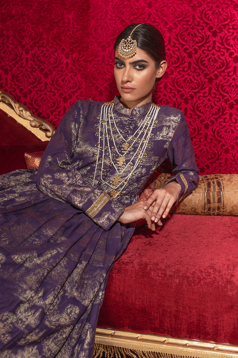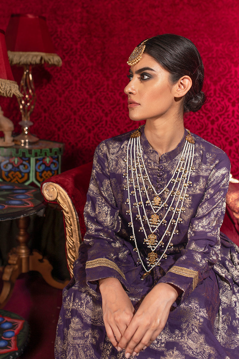 Lawn Jacquard Long Pishwas with Pleats at body and Gota Lace on Sleeves.