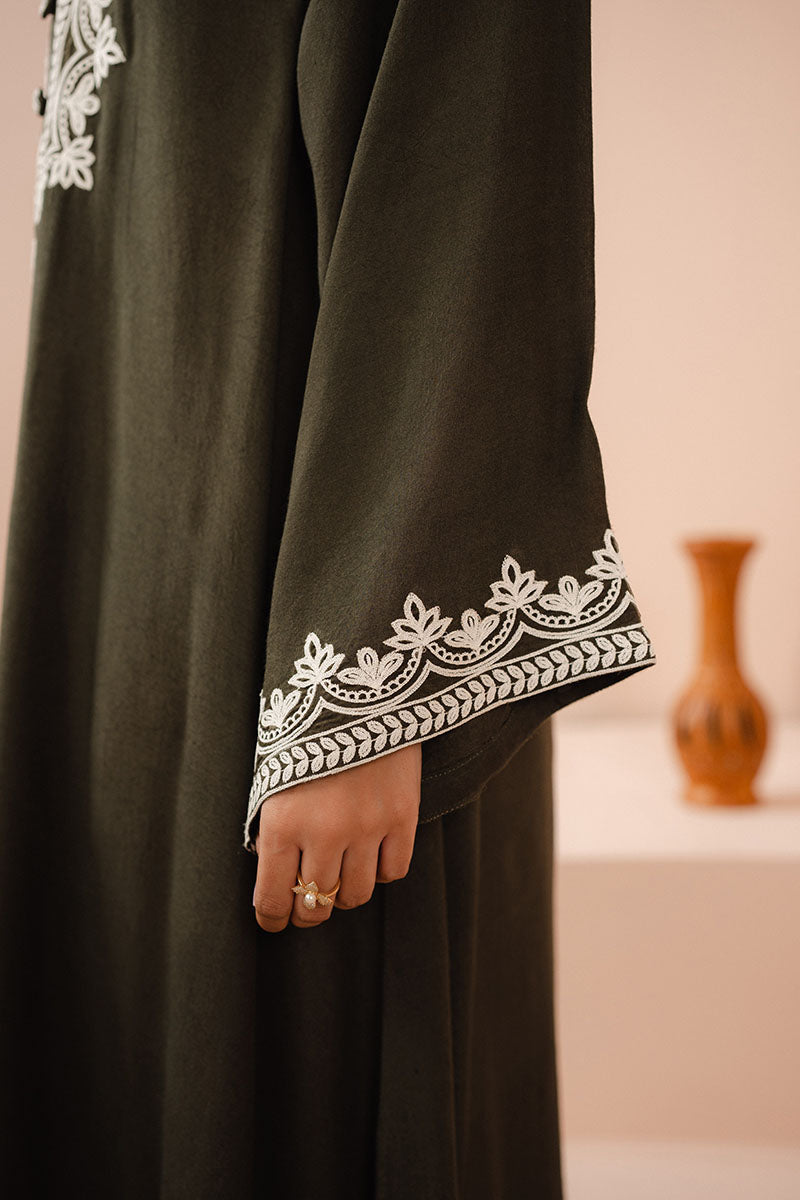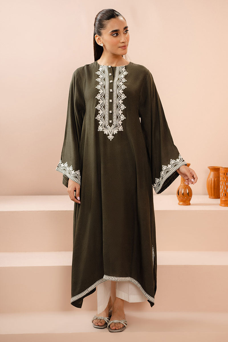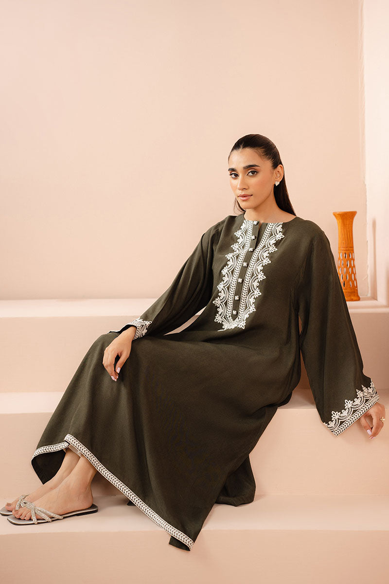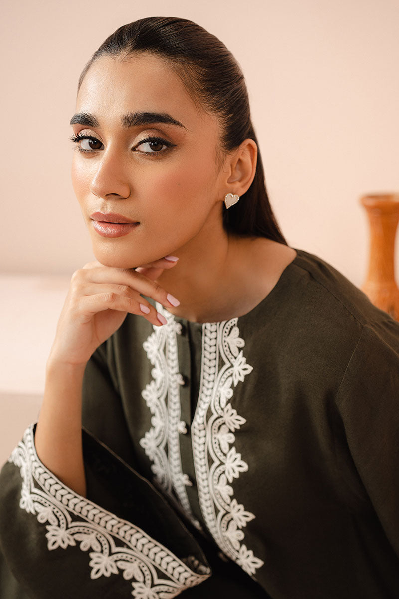 The IVY MEADOW DYED LINEN SHIRT features an A-line silhouette with drop corners and a plain dyed front and back. The neckline is round and embellished with a button detail, while the box sleeves have an embroidered border.