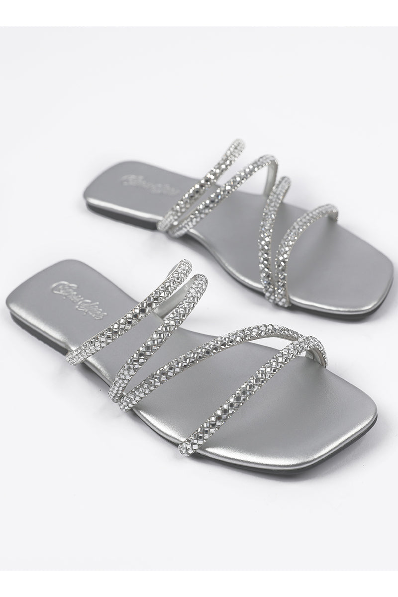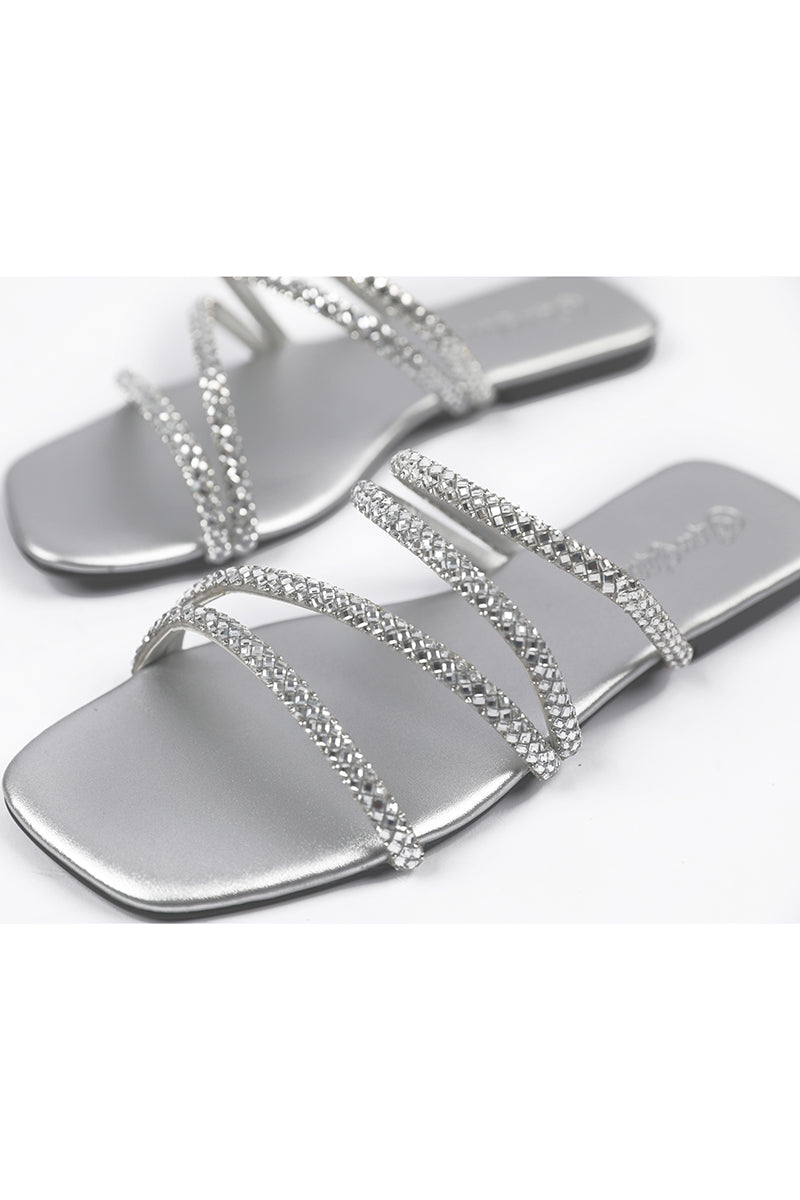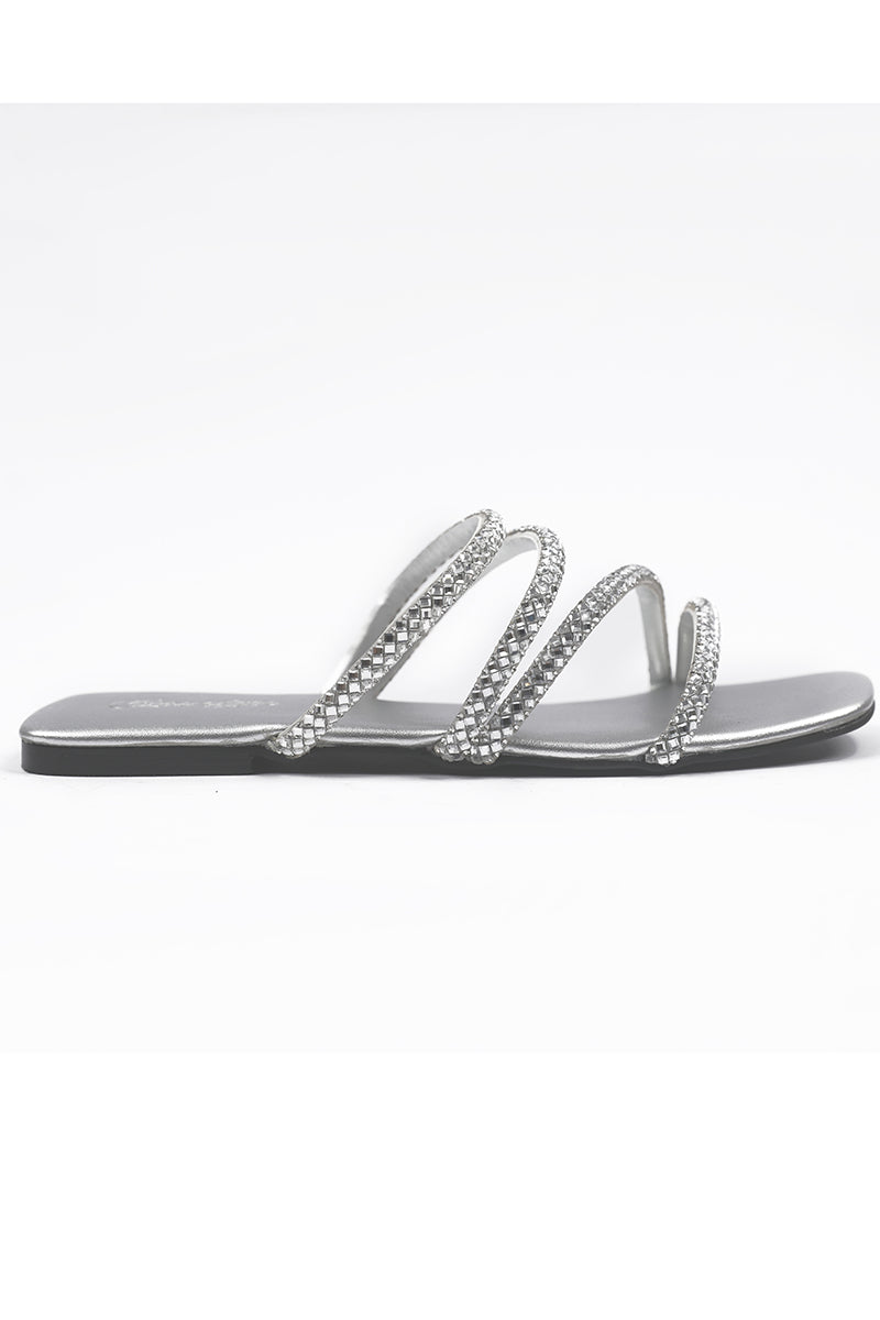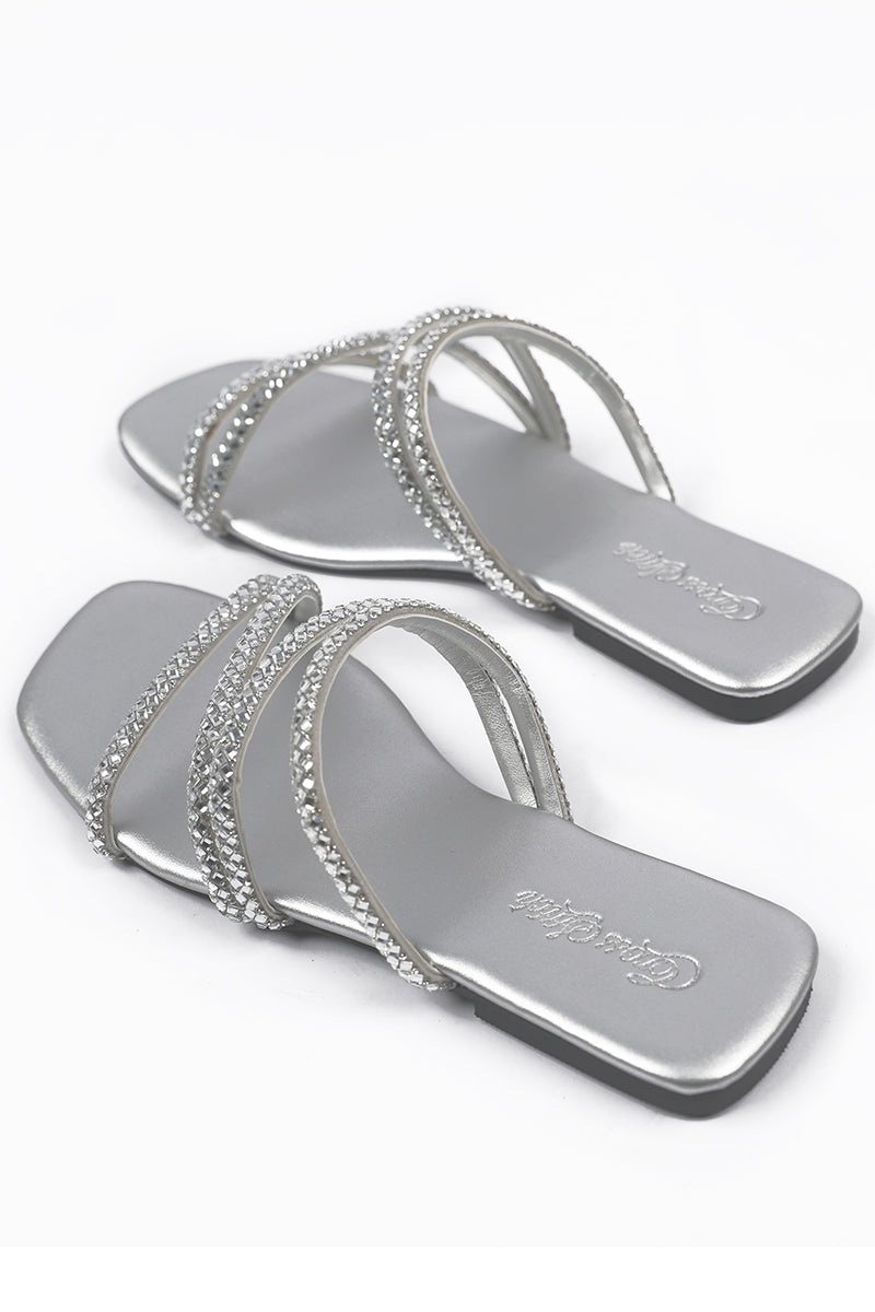 - Silver strappy slides with a subtle silver base to complete your elegant wedding look.
