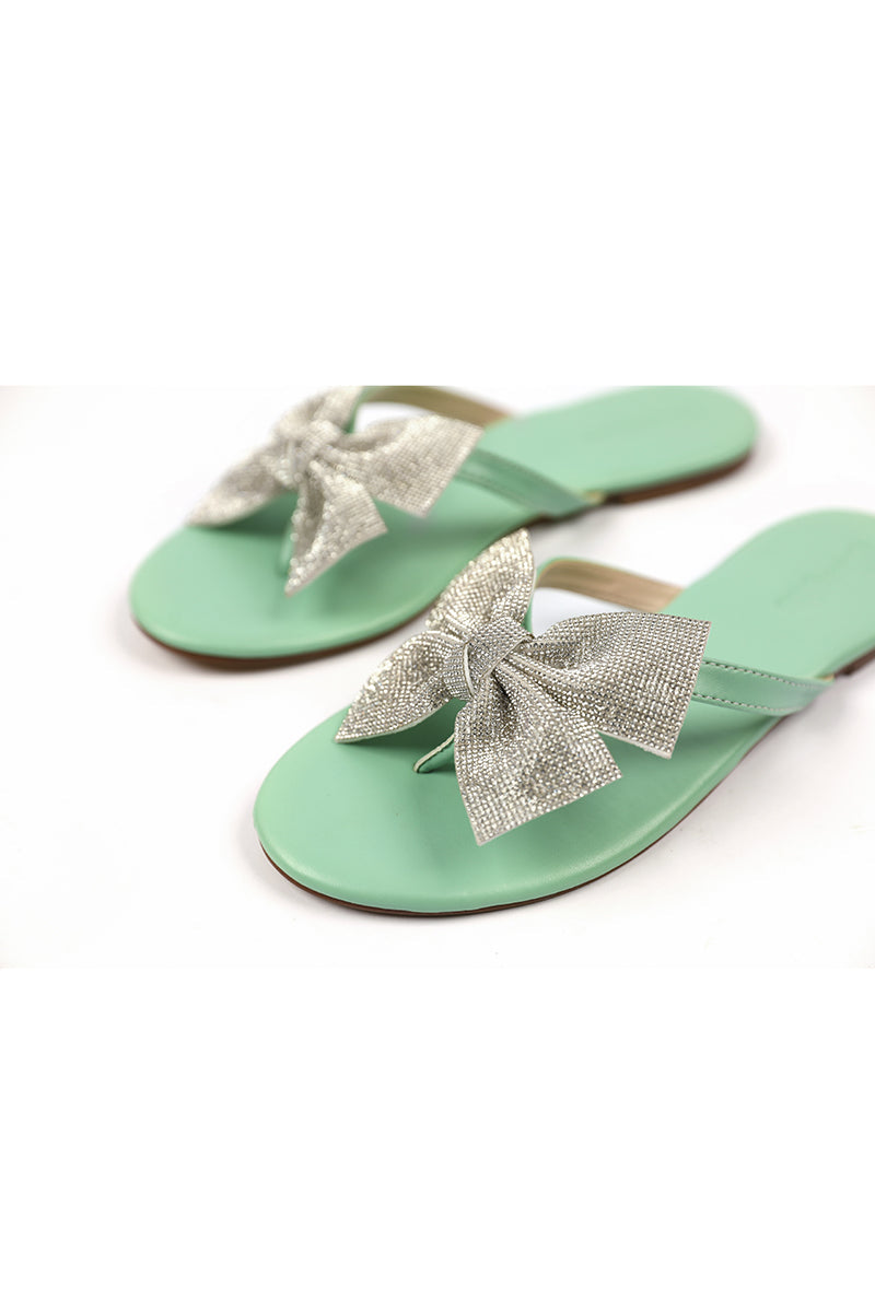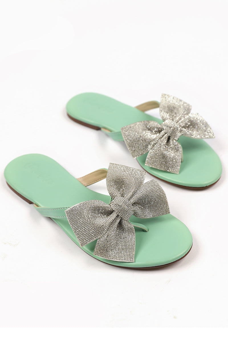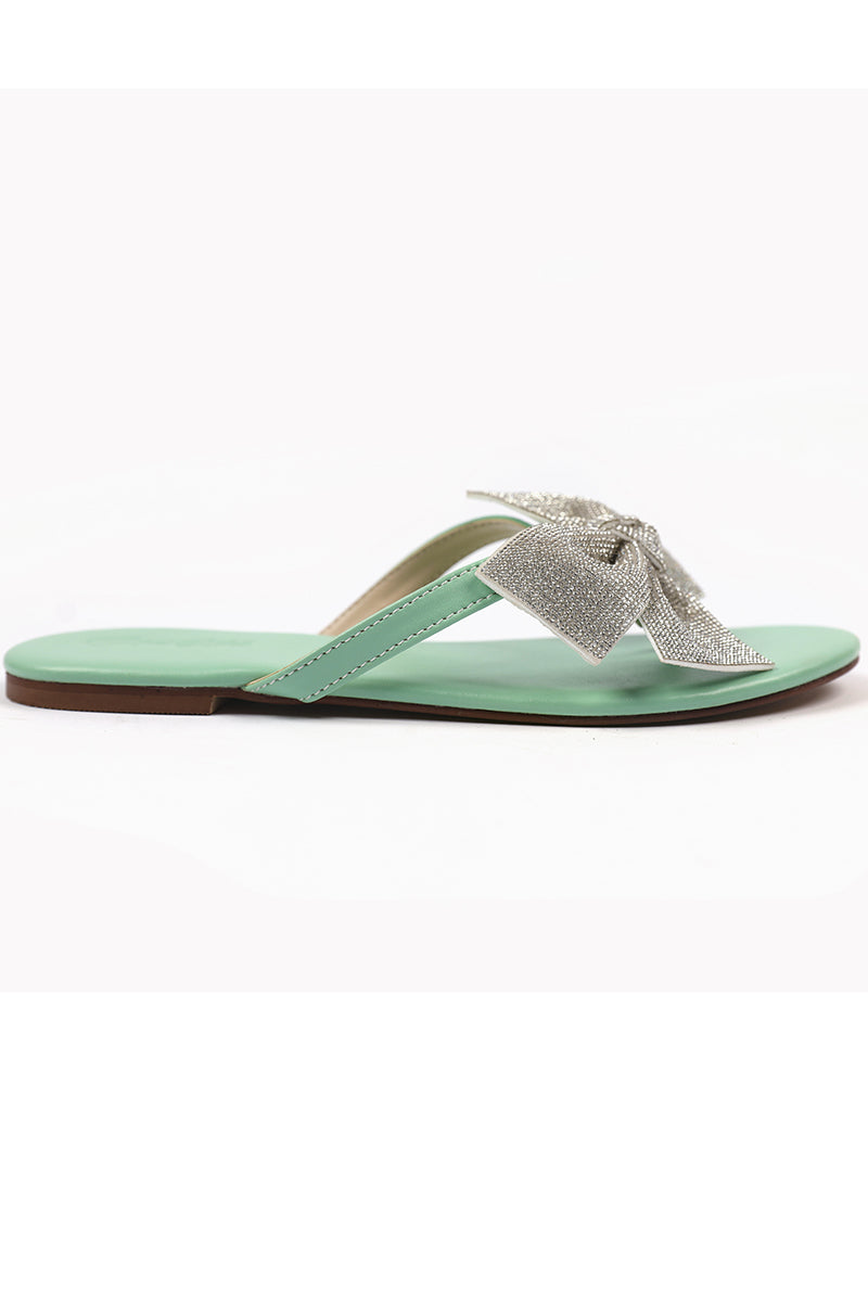 Miner slides with a dazzling silver bow, to complete your casual evening look.