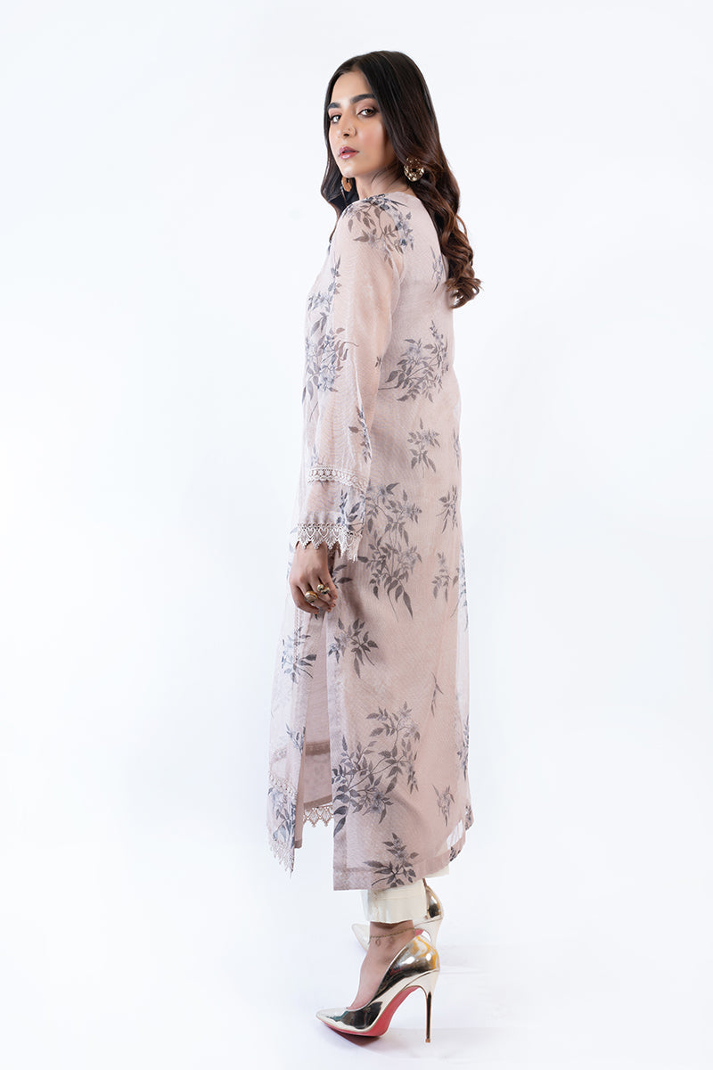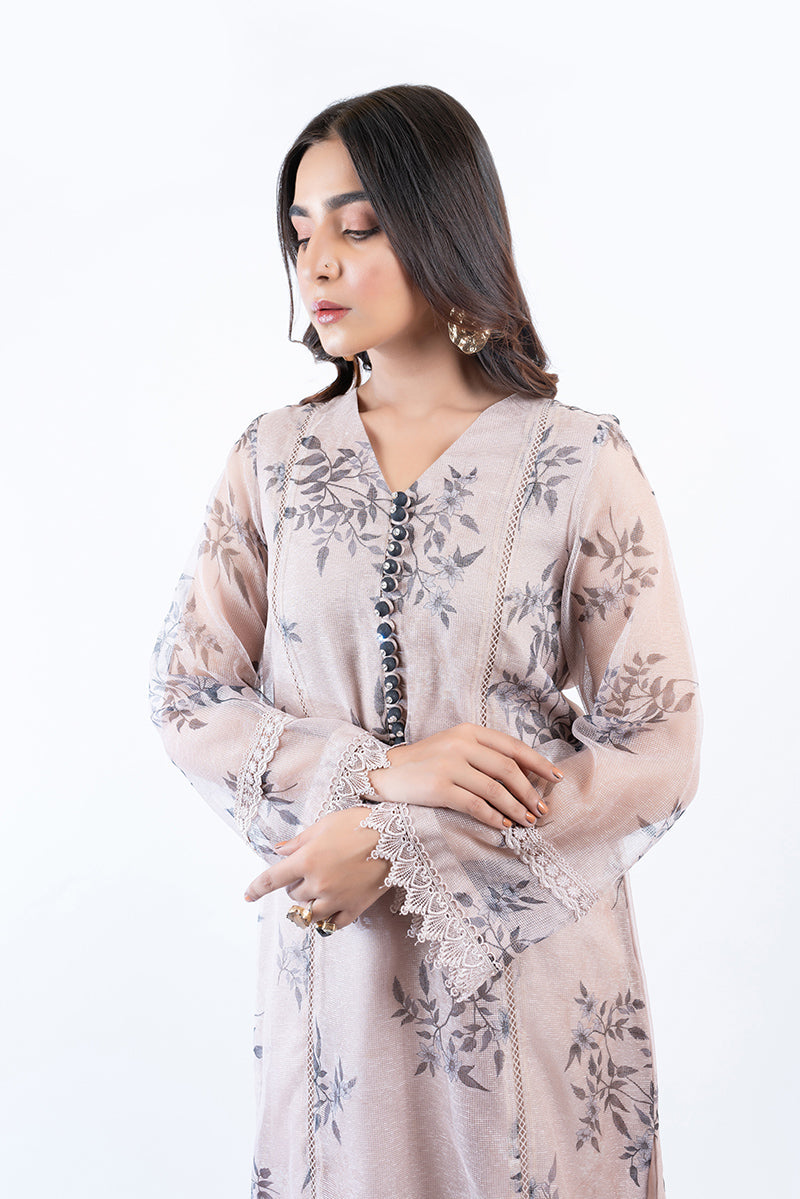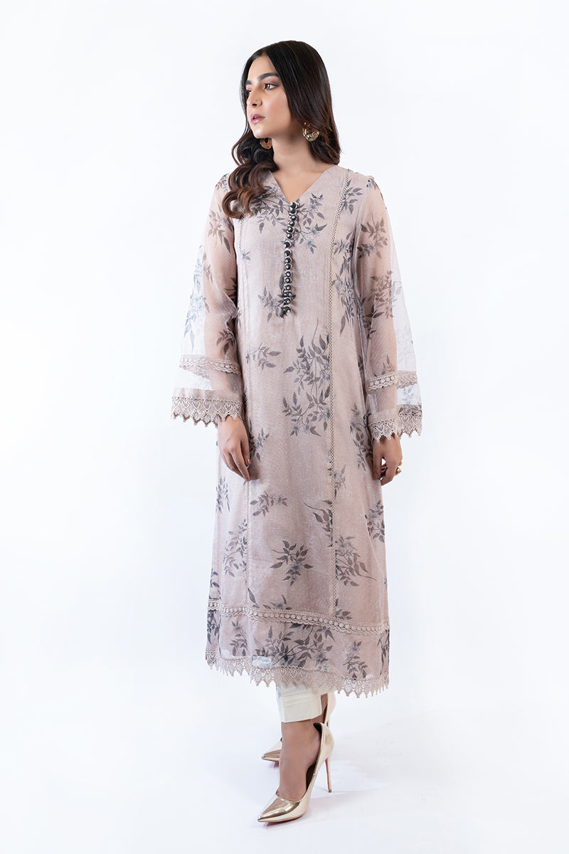 A long parallel patterned border and sleeves with a showcase of lined buttons top. Lacey leaf is a pastel love story that goes with a white bottom for its elegance and heels to match.