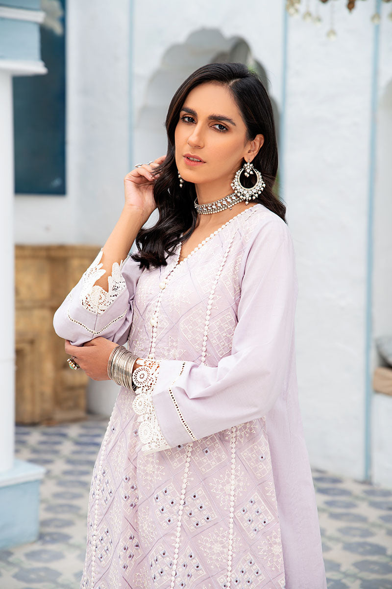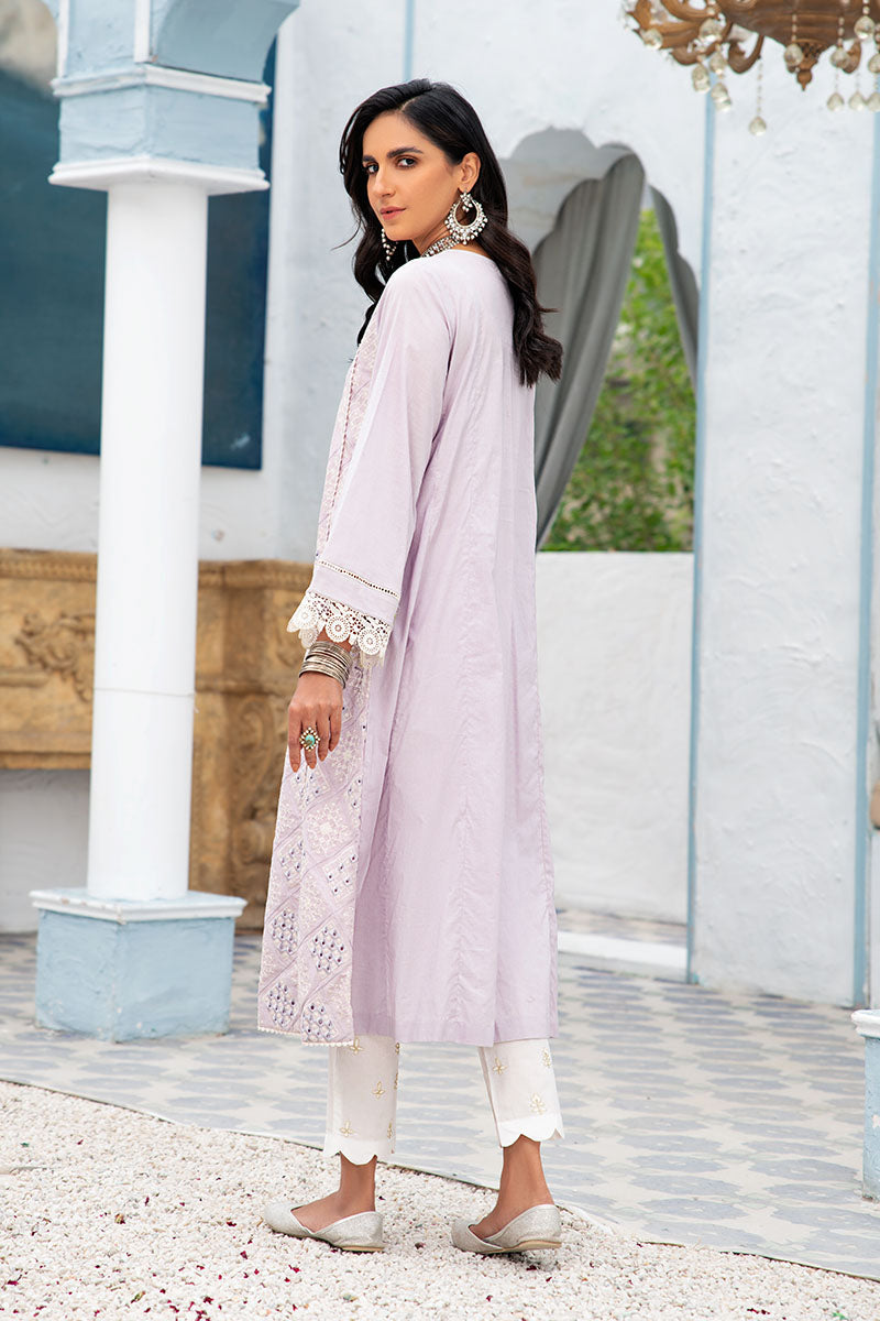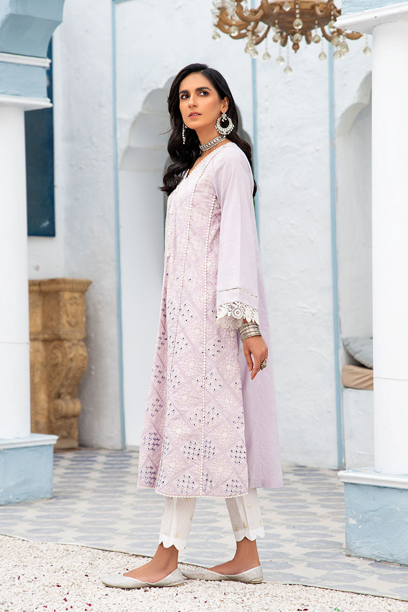 STYLE NOTE: STUNNING CHIKANKARI LILAC DETAILED KURTA WITH EMBELLISHED LACE DETAILS ON THE SLEEVES AND NECKLINE.