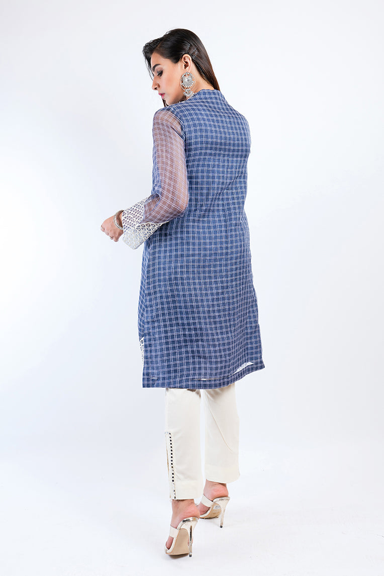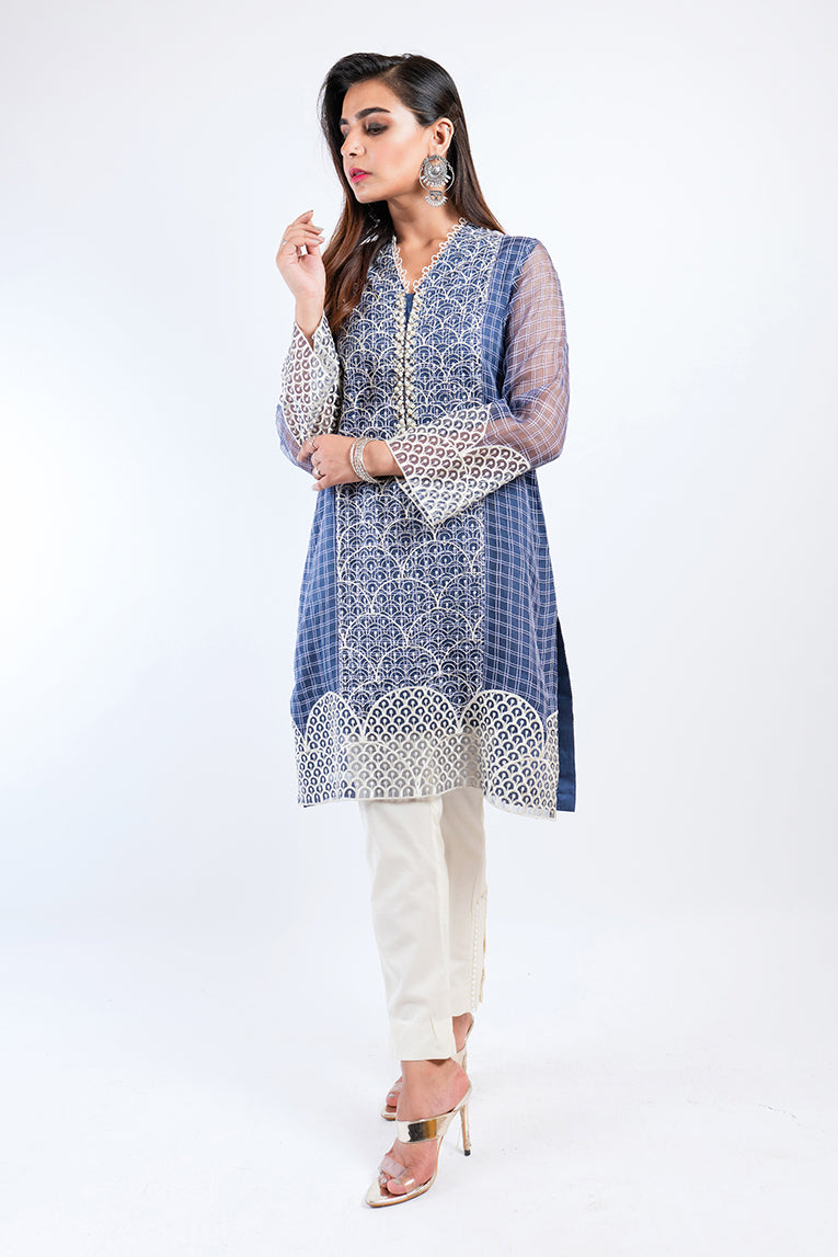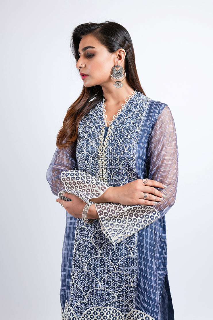 Deep sea blue design net shirt with a detailed front and sleeves work. The embroidery is a perfect blend for a white bottom with sheesha work to boost the look.