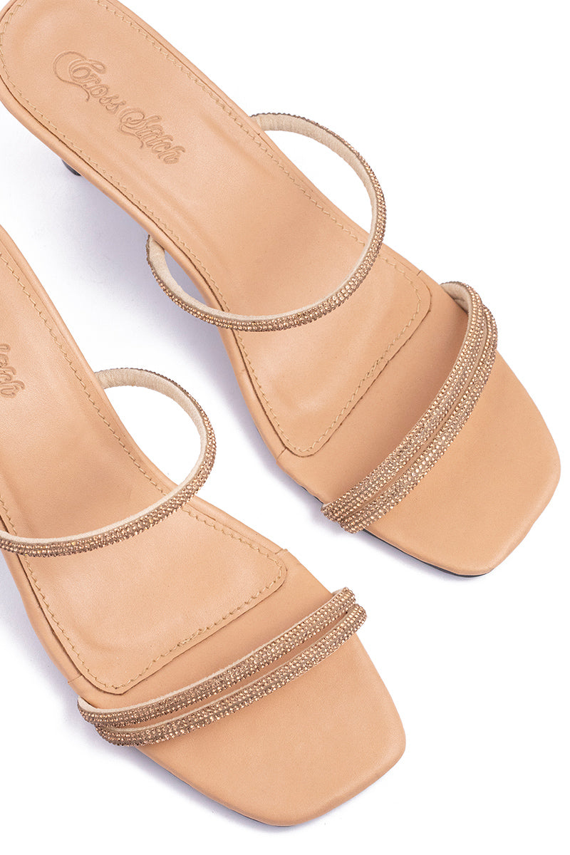 Sleek straps upper adorned with rhinestone detailing and open toe style with beige base. this season, pair this appealing heel with fashion-forward attire.
