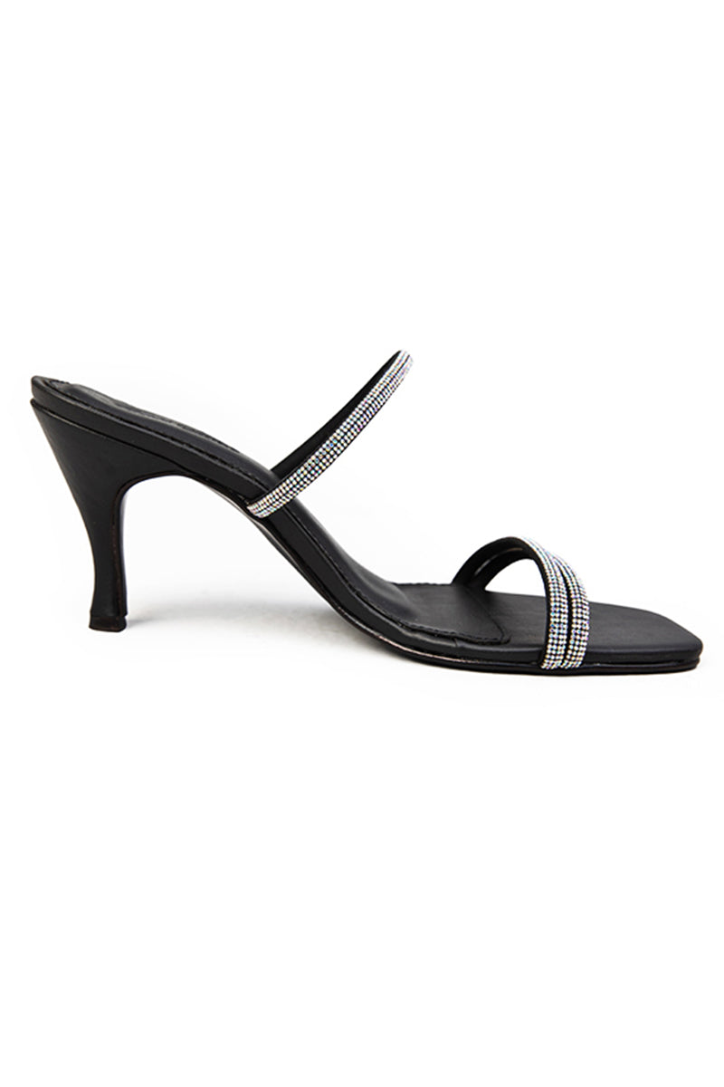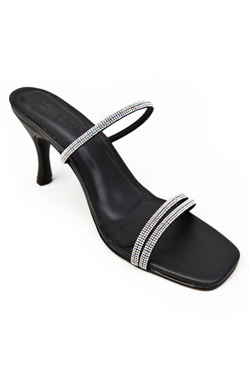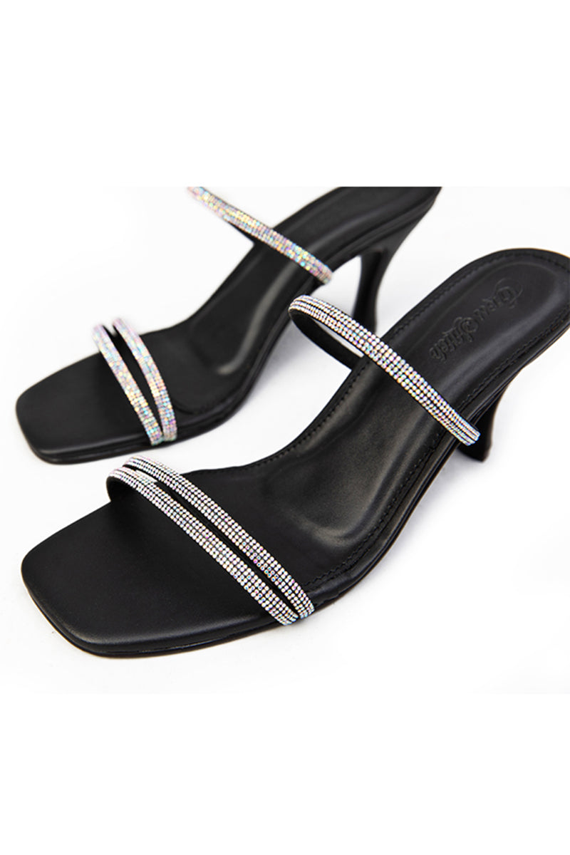 FOOTWEAR:Elegant rhinestone accents on the upper straps and an open-toed style on a black base make this heel perfect for this season's fashion forward outfits.
