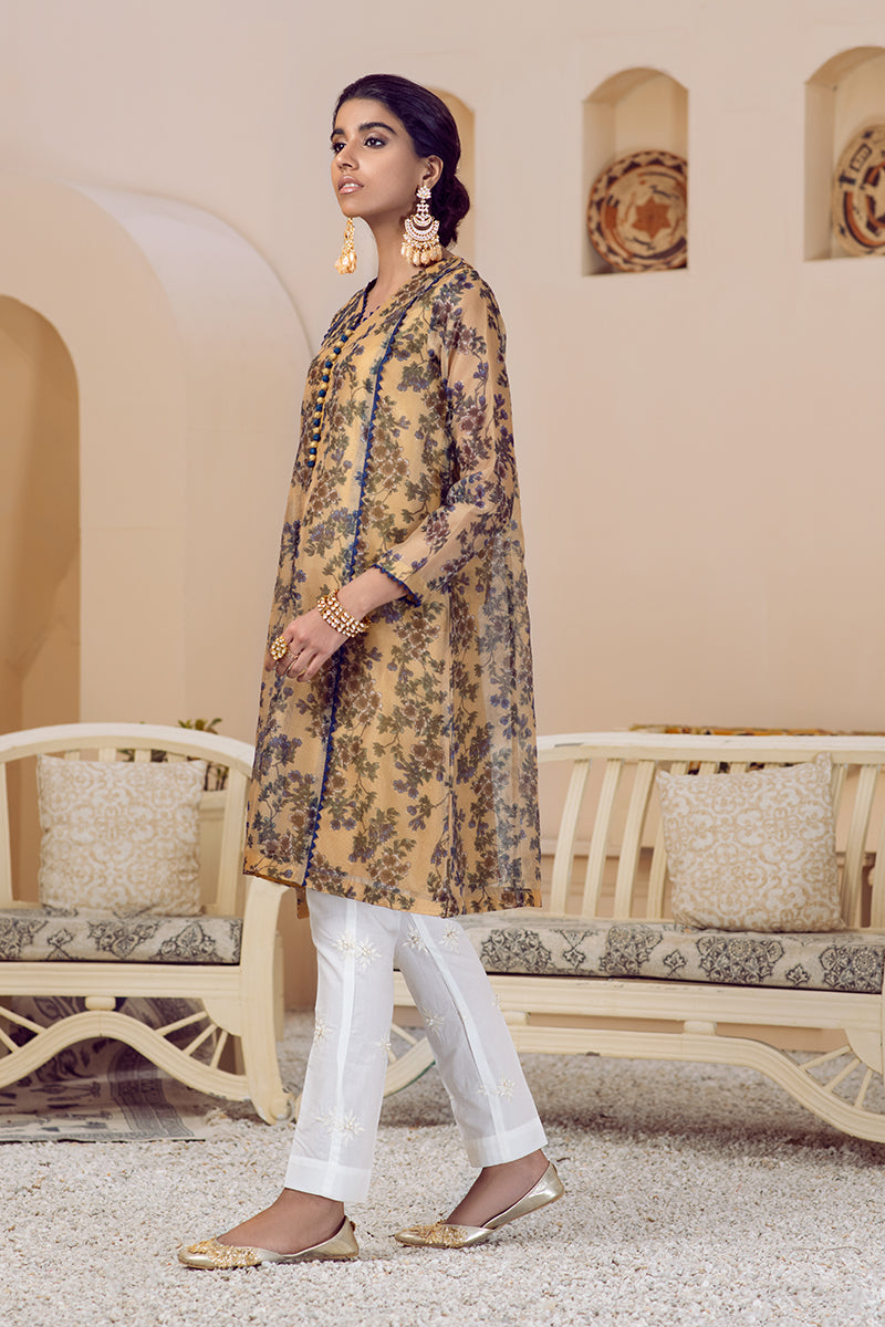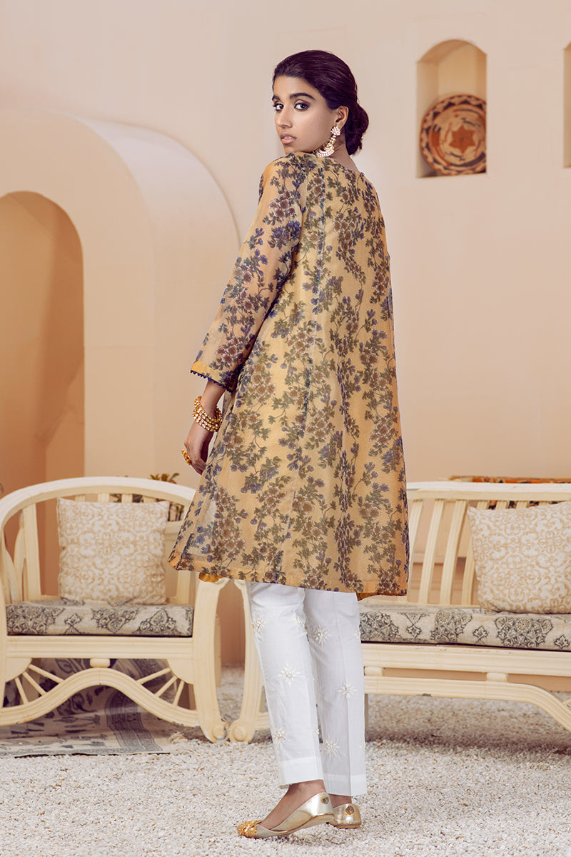Somber Floral Details Digitally Printed on a Yellow Base makes this Panelled Frock Serene and Easy on the Eye. Style with Raw Silk pants for a Formal Vibe.