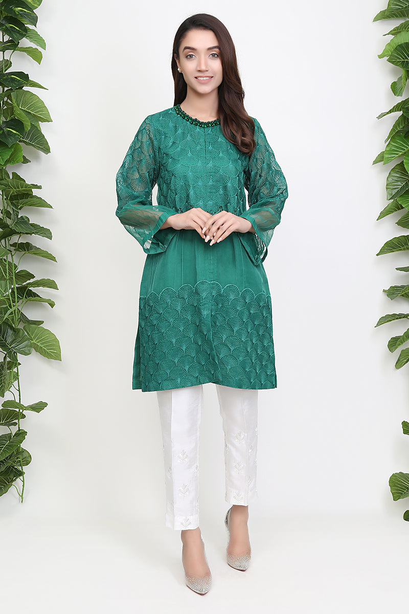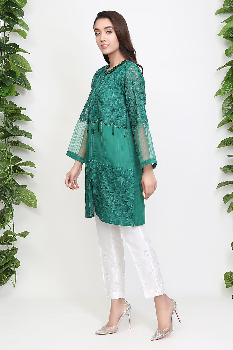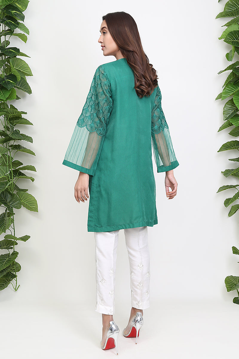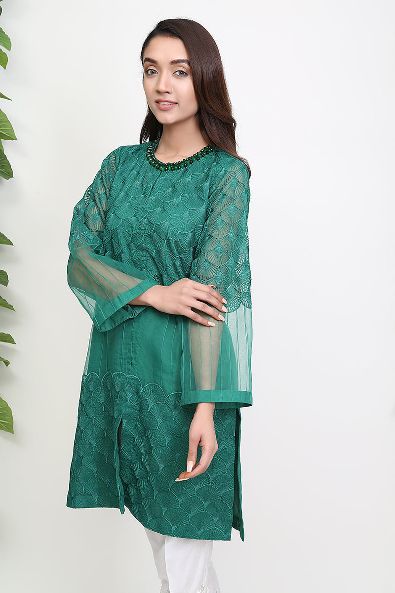 A net green shirt with embellish work on the sleeves and border gives this kurta a unique look to carry. Pair it up with a straight cut trouser.