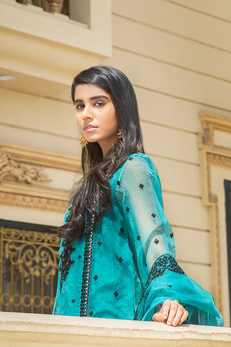 Emerald Green Kurta On Poly Organza with Beautiful Black Threadwork. Pair with Our Range of Pants to Create a Festive Look.