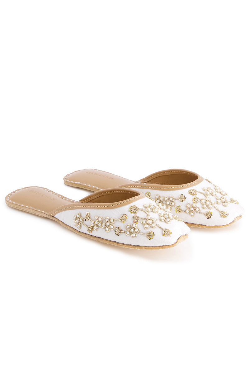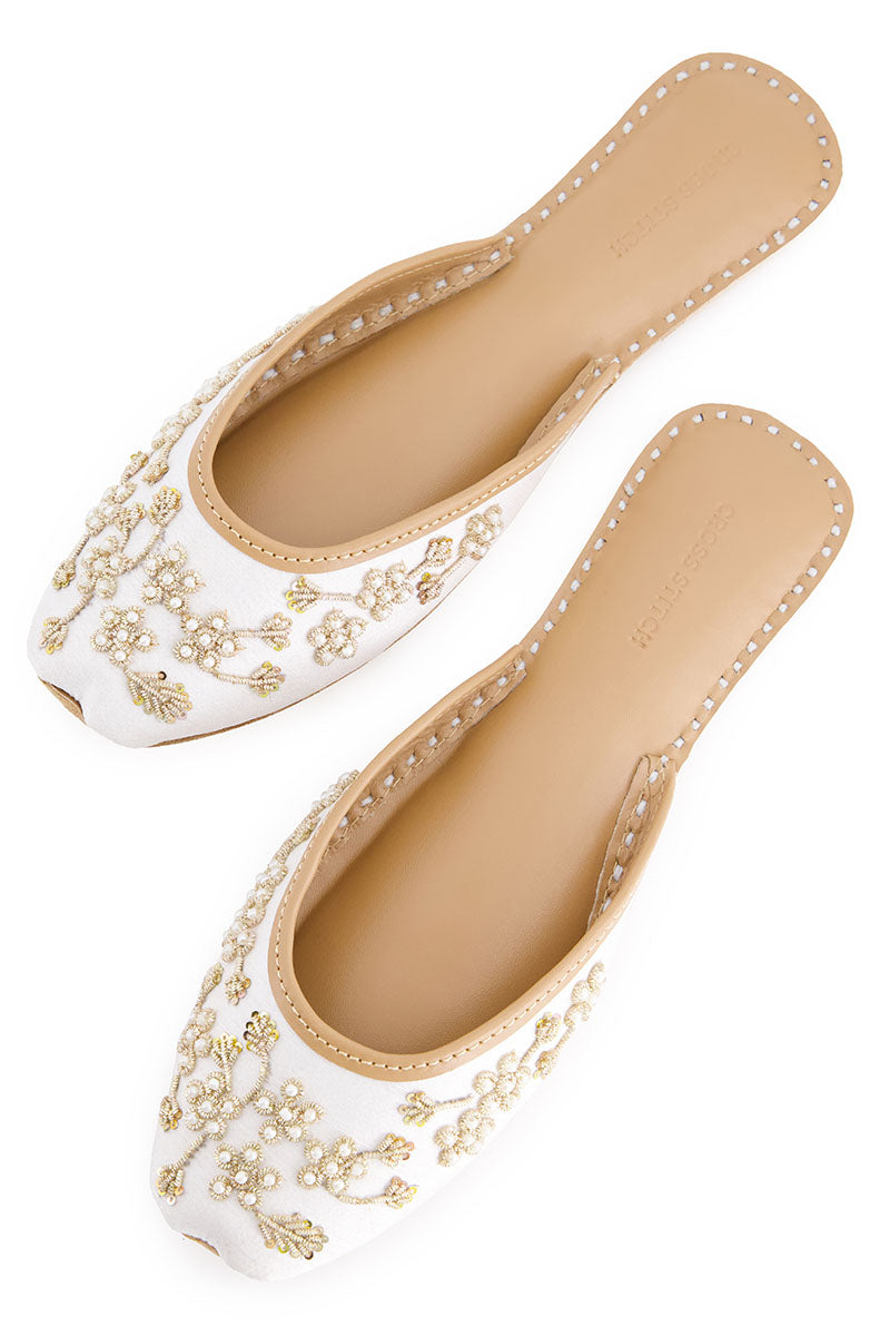 MARIE-3, a traditional Khussa with a modern twist. Hand-crafted with exquisite bead embellishments, these satin shoes offer both style and comfort with padded insocks and a leather outsole. Elevate your look with this unique and luxurious footwear.