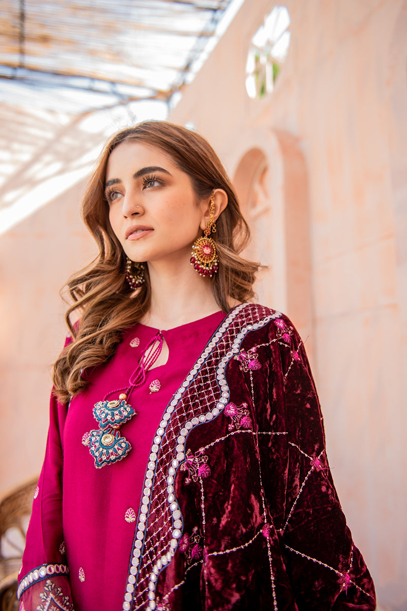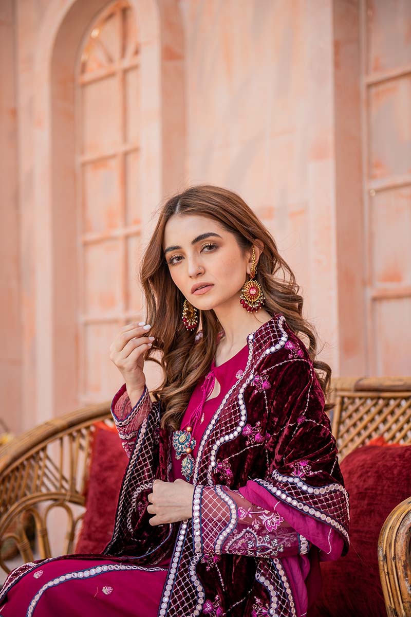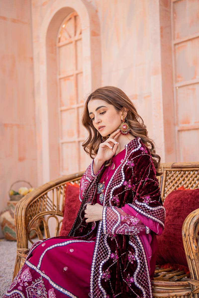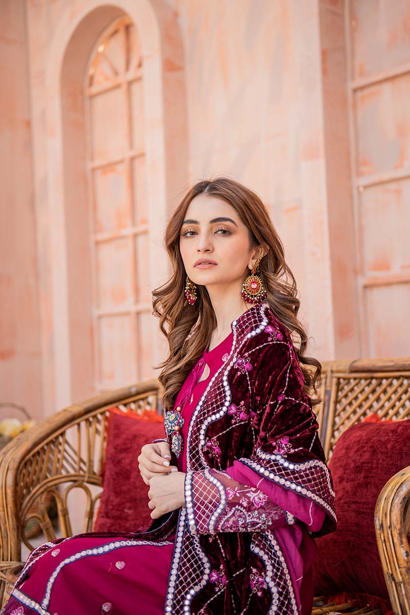 Beautiful A-Line shirt with Pret detail faux mirror embroidery, the hand-made tassel adds perfect value to it. A beautifully embroidered velvet shawl with Sheesha embroidered borders.