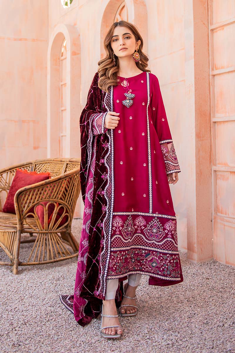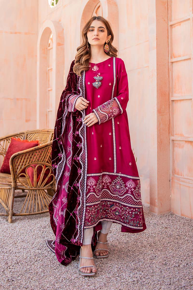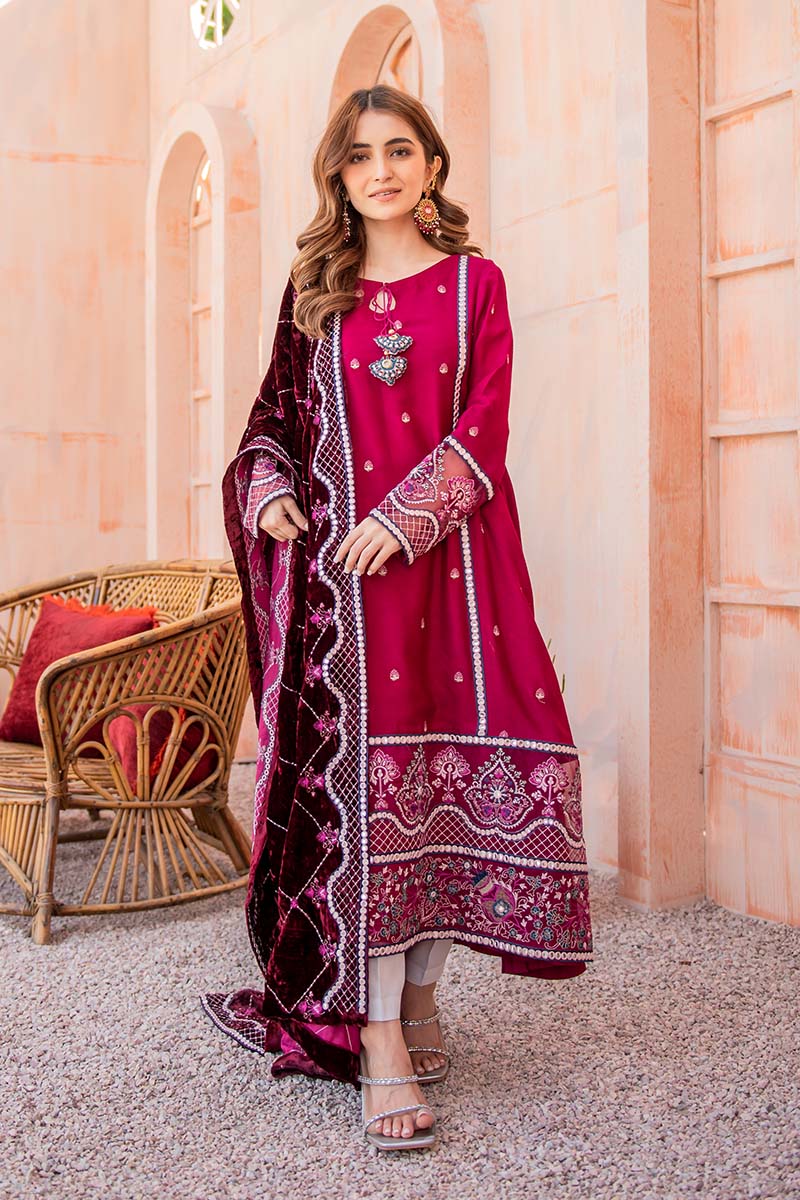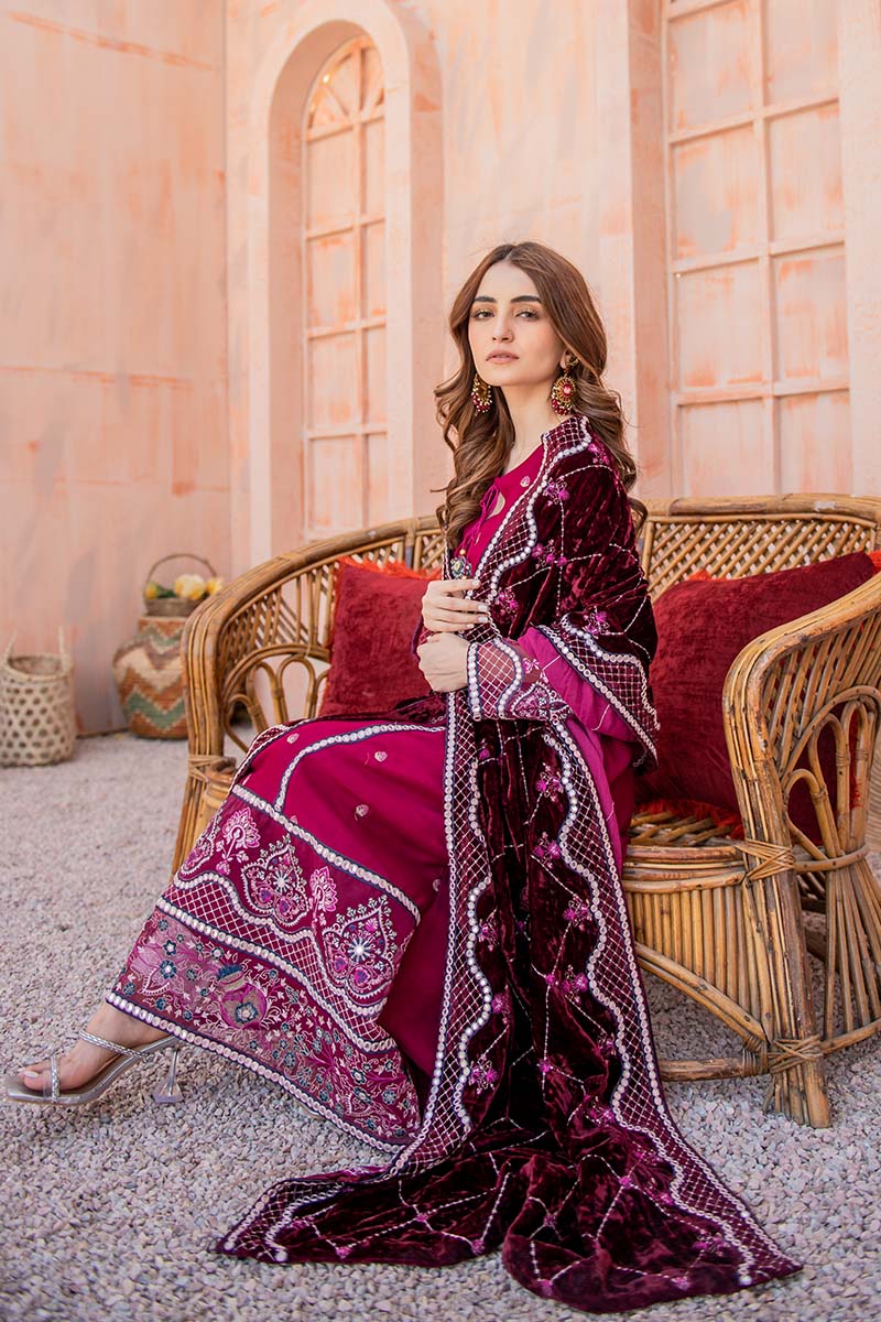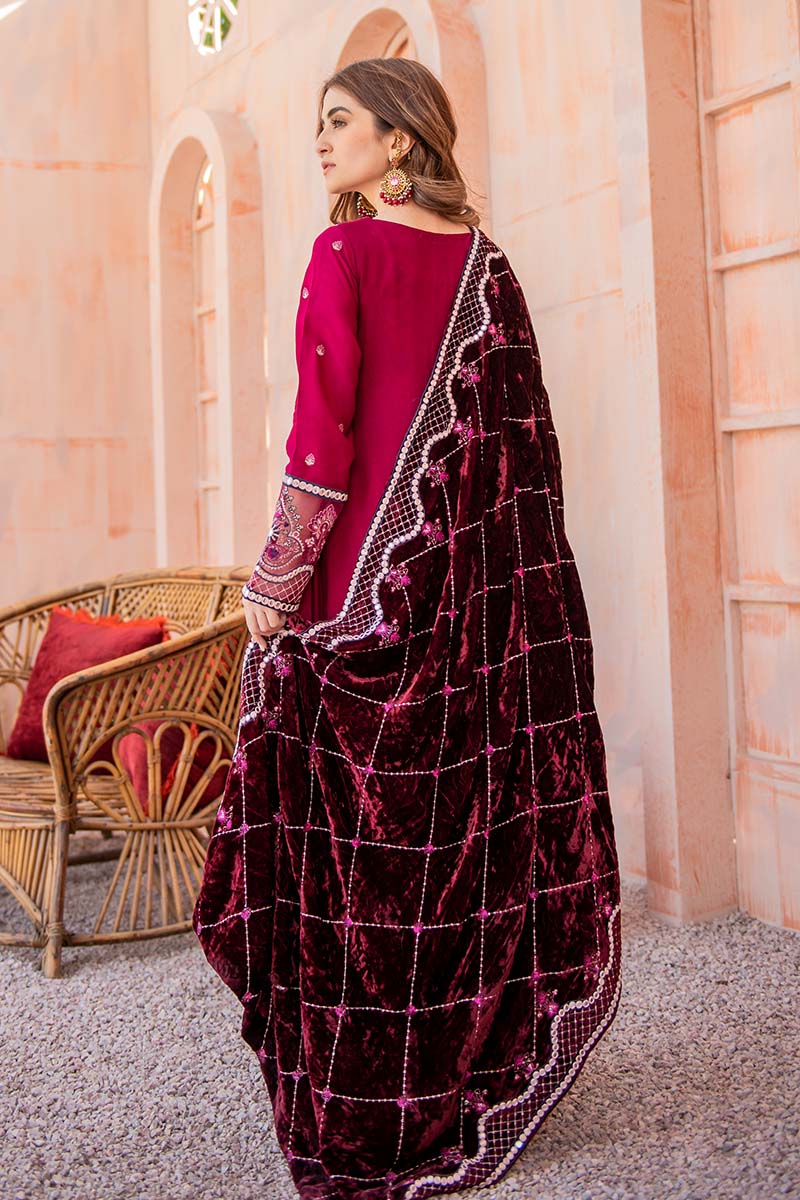 Beautiful A-Line shirt with Pret detail faux mirror embroidery, the hand-made tassel adds perfect value to it. A beautifully embroidered velvet shawl with Sheesha embroidered borders.