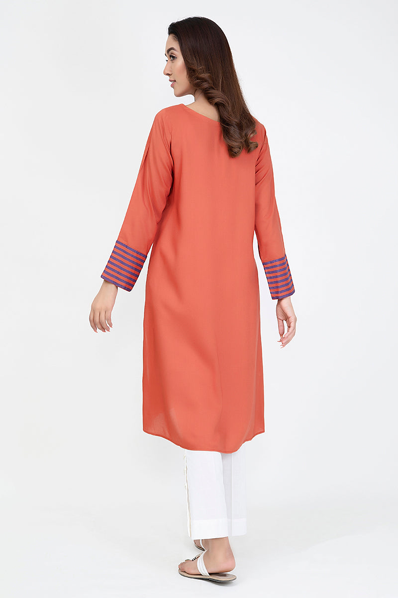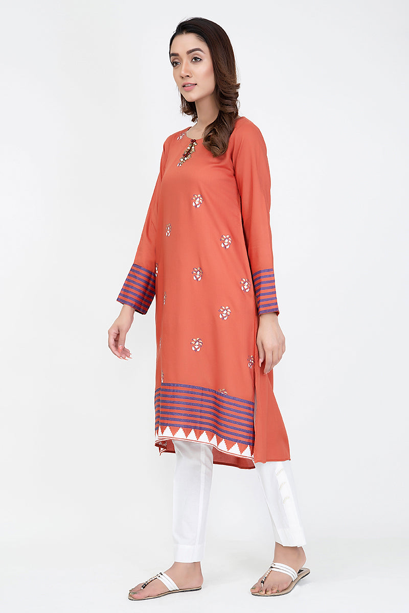 Highlights of orange reflect ideally in this basic karat. The Meena Kari has a penchant to go with a cream white trouser or shalwar, adding flats for casual appearance.