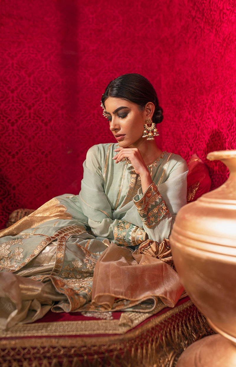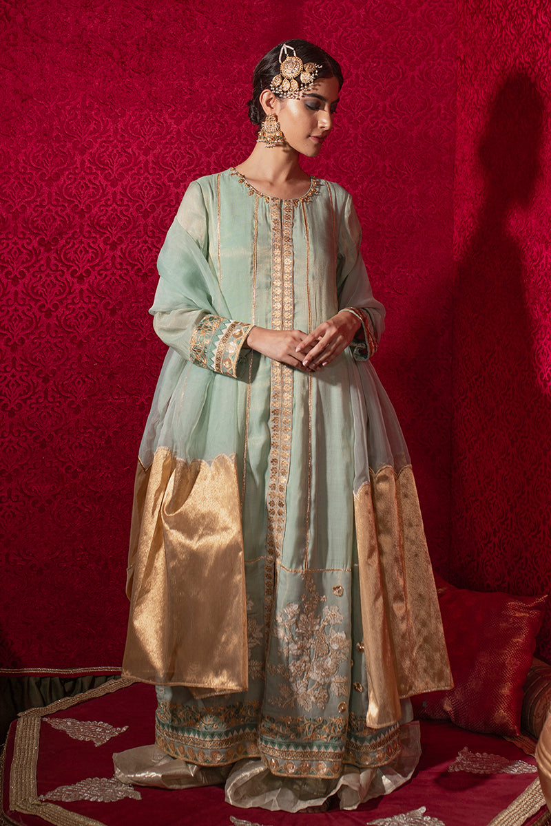 Shirt: Floor-length pishwas with handwork on neckline and heavy embroidery borders at the hem along with gota work details on Missouri fabric with beautiful gold finish.