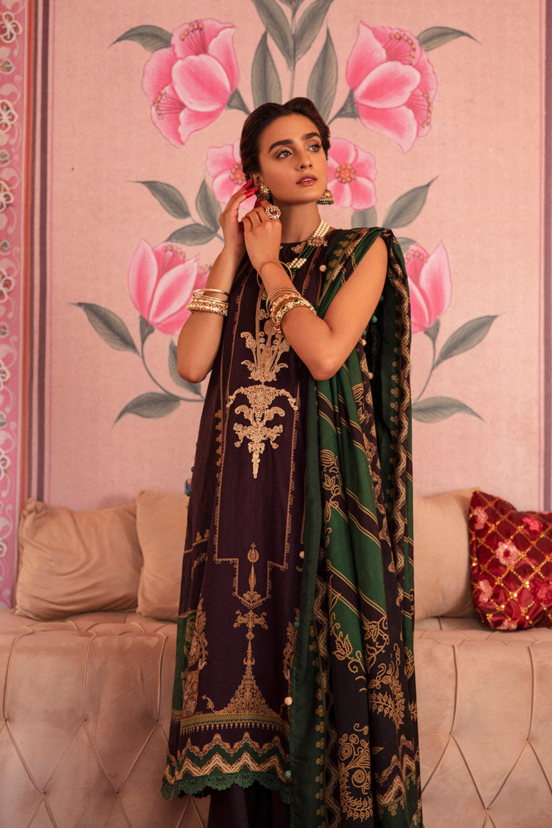 This royal three piece linen suit is a must buy this winters. It has a very royal feel to it with the blend of traditional motives with a delicate embroided neckline rendered in gold thread .