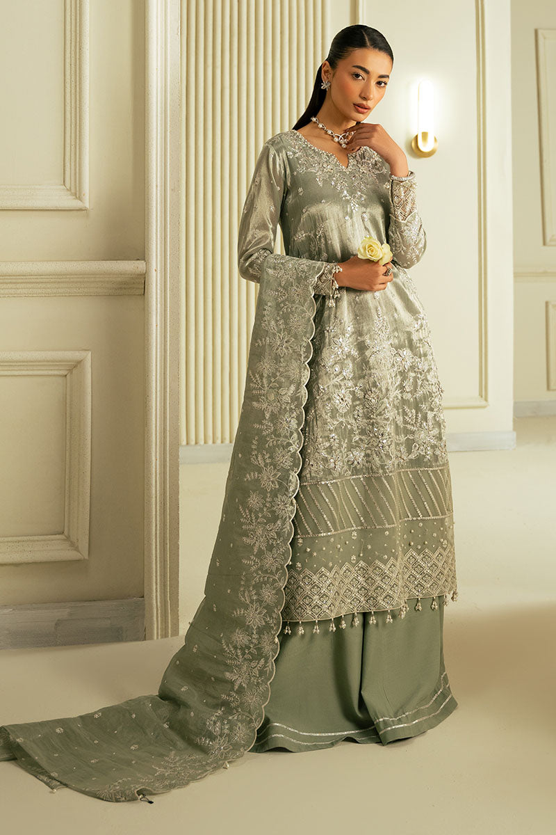 Elevate your look with our MUTED MIRAGE-3PC set. The long A-line shirt features intricate sequin and embroidery details on the front and back, complemented by a beautifully embellished neckline and fitted sleeves with tassel accents. Complete the ensemble with the luxurious silk palazzo pants and tissue embroidered dupatta.