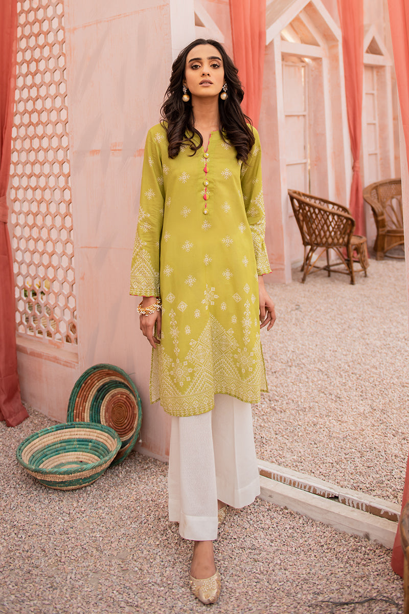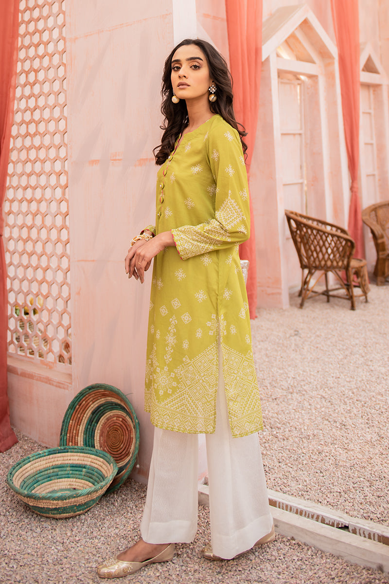- Live the Summer Dream in this Lime Green Digital Printed Kurta with Button Details on the Round Neckline with a Slit. Pair the Kurta with Flared Pants Gold Accent Jewelry