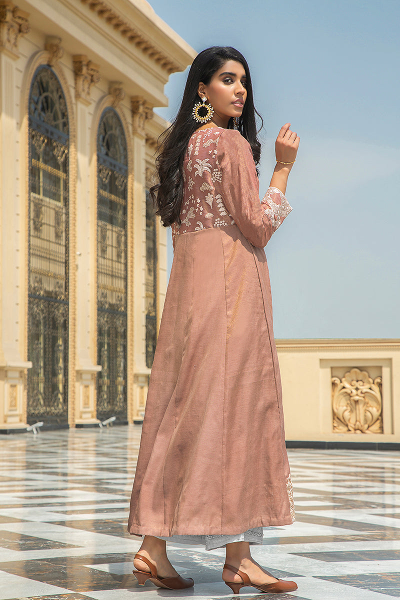 Nisa is a Pink Full-Length Frock Designed on Missouri Fabric. Opt for Wide-Legged Trouser and Chunky Earrings to Complete The Look.