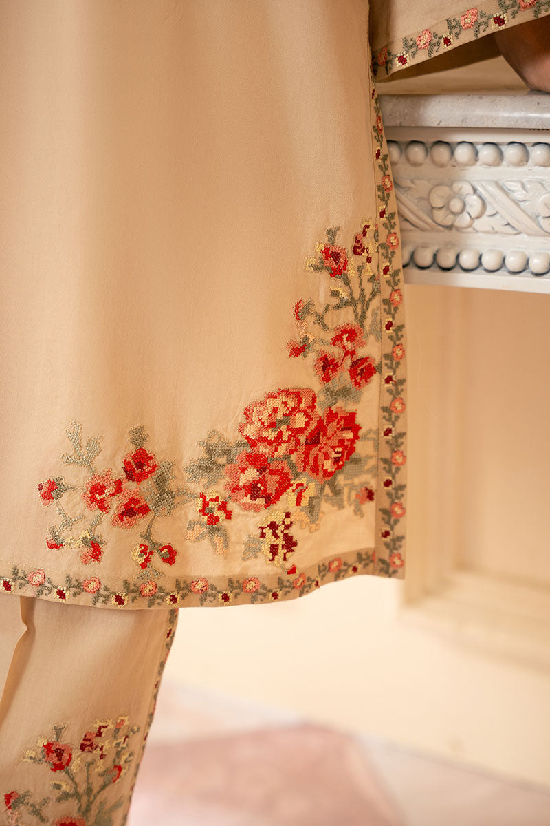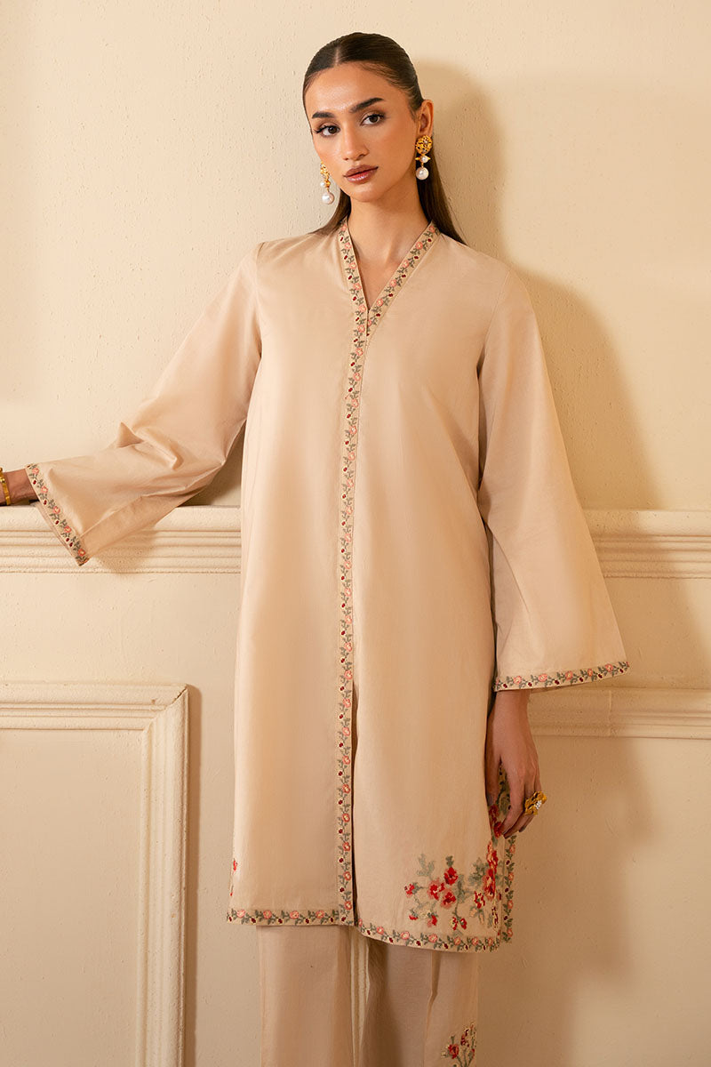 - This two-piece set features an open A-line shirt with impressive embroidery patches on the front and at the border of the flared sleeves, tied together with a wrap around front open neckline. The plain dyed trousers boast an elegant embroidered motif and a side border box pattern. Perfect for a sophisticated look.