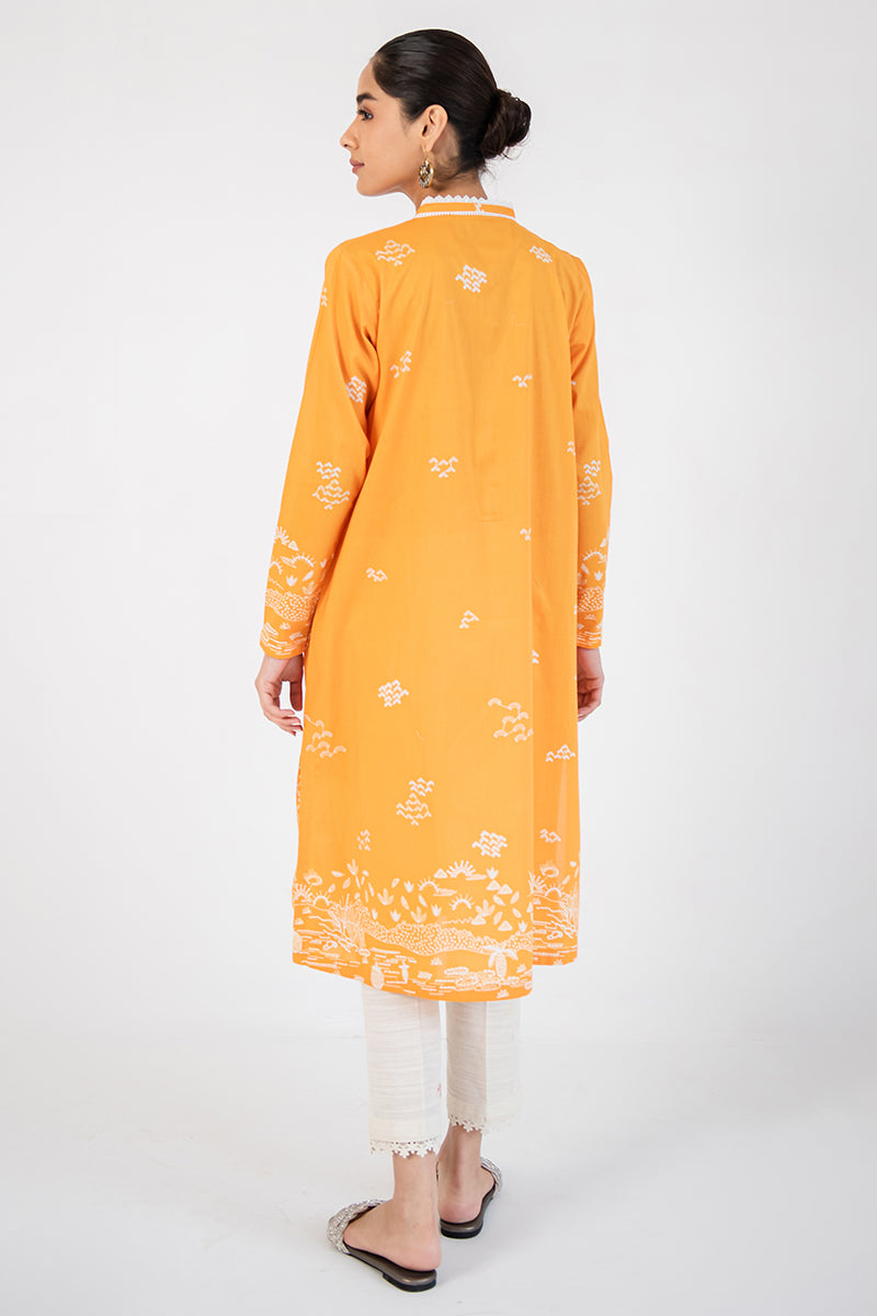 OCHRE GLOW IS A STYLISH A-LINE TUNIC DESIGNED WITH PANELS FOR ENHANCED SILHOUETTE. CRAFTED FROM LAWN FABRIC, THIS CHIC TOP FEATURES WRAP-AROUND NECKLINE WITH BEAUTIFUL LACE DETAILS, AND FITTED SLEEVES FOR A FLATTERING LOOK. THE PIECE IS DIGITALLY PRINTED ON THE FRONT AND BACK FOR AN EYE-CATCHING FINISH.