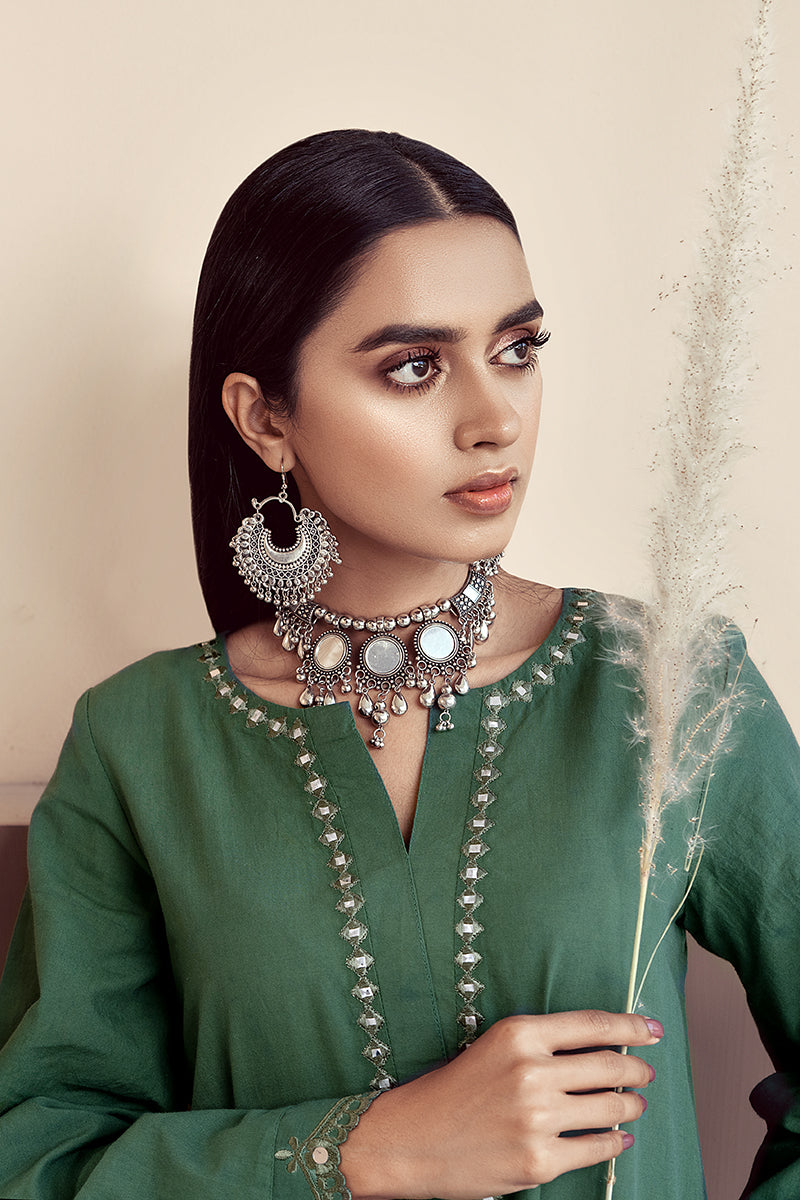 Pinch of green on linen with embellish work is a dreamy affair in this kurta. Pair it with a straight embroidered bottom and khussa on the go.