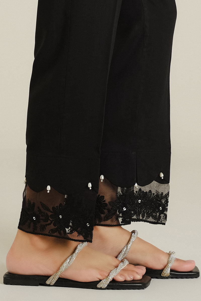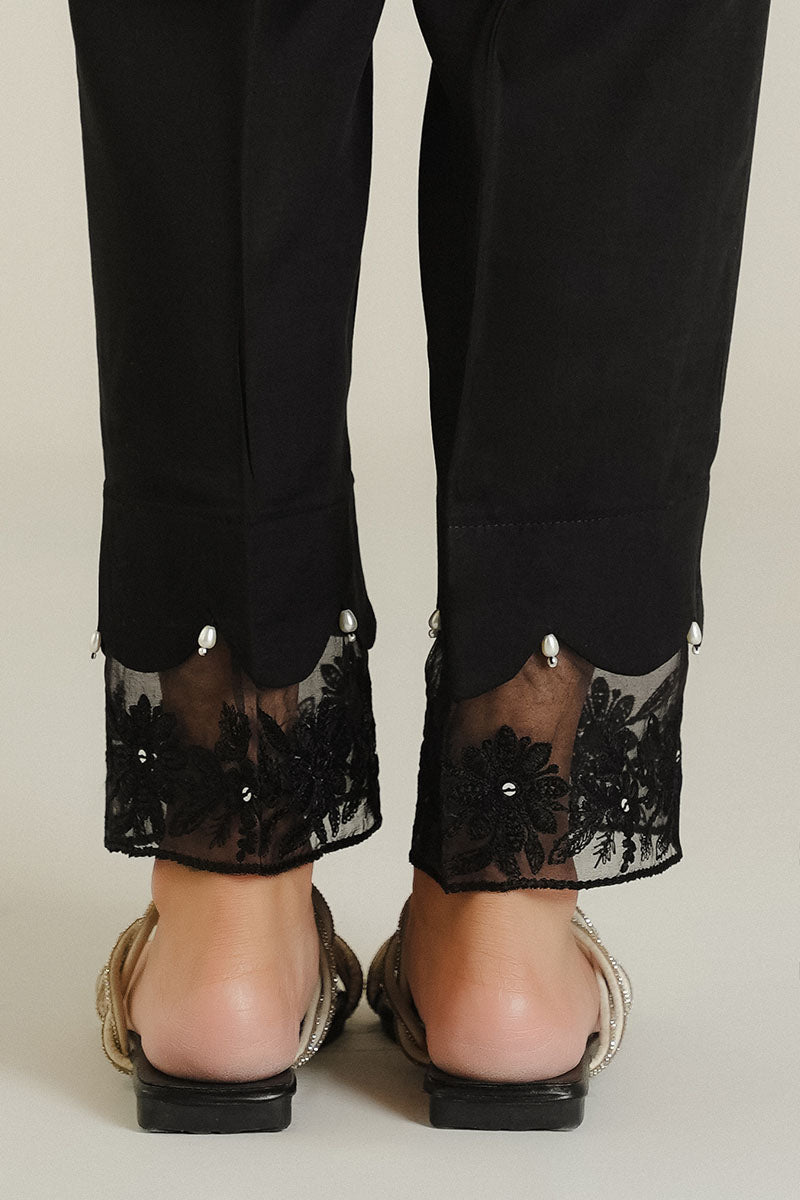 LINEN DYED AND EMBROIDERED WITH TASSELING DETAIL STRAIGHT FITTED PANTS