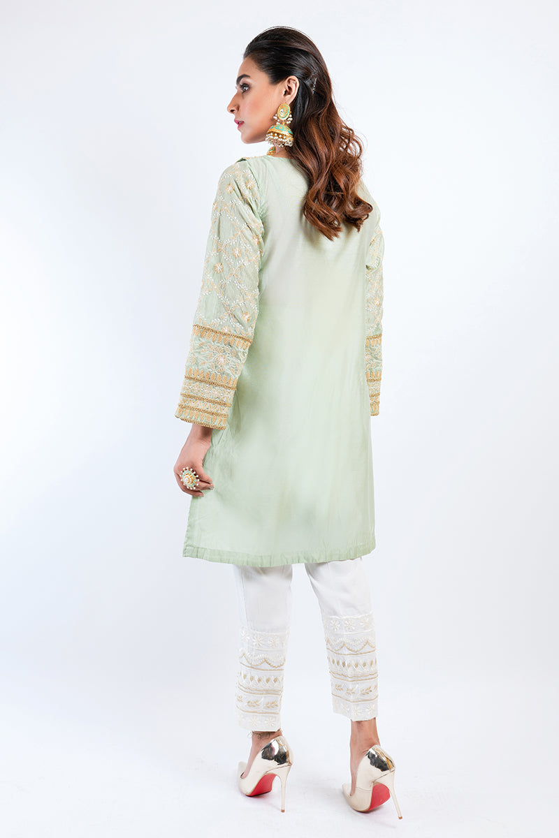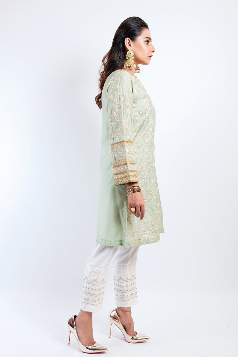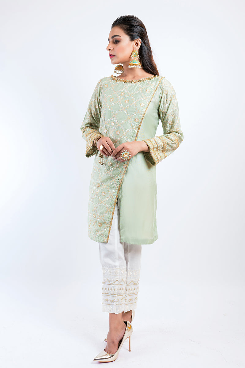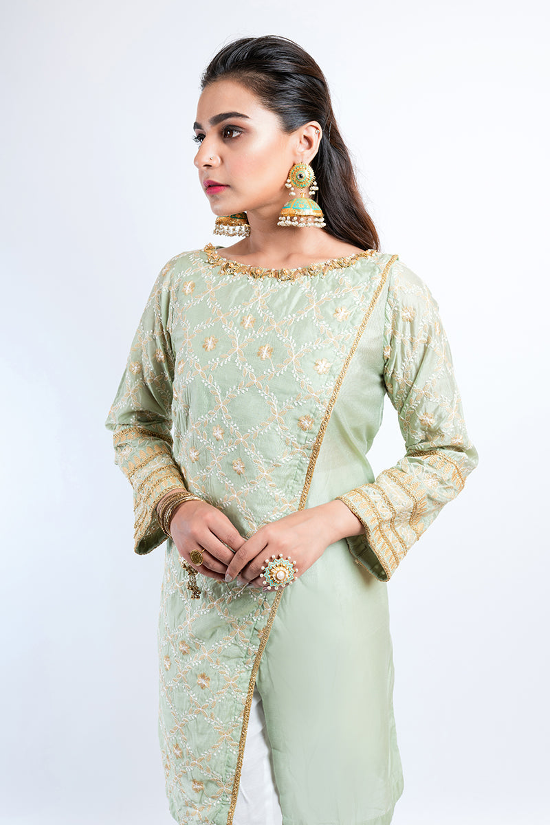 Pastel beam is a promise of radiance that reflects in it's pistachio undertone. The kurta feels fabulous with earrings and chooriyan for a traditional feel.