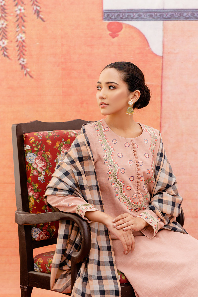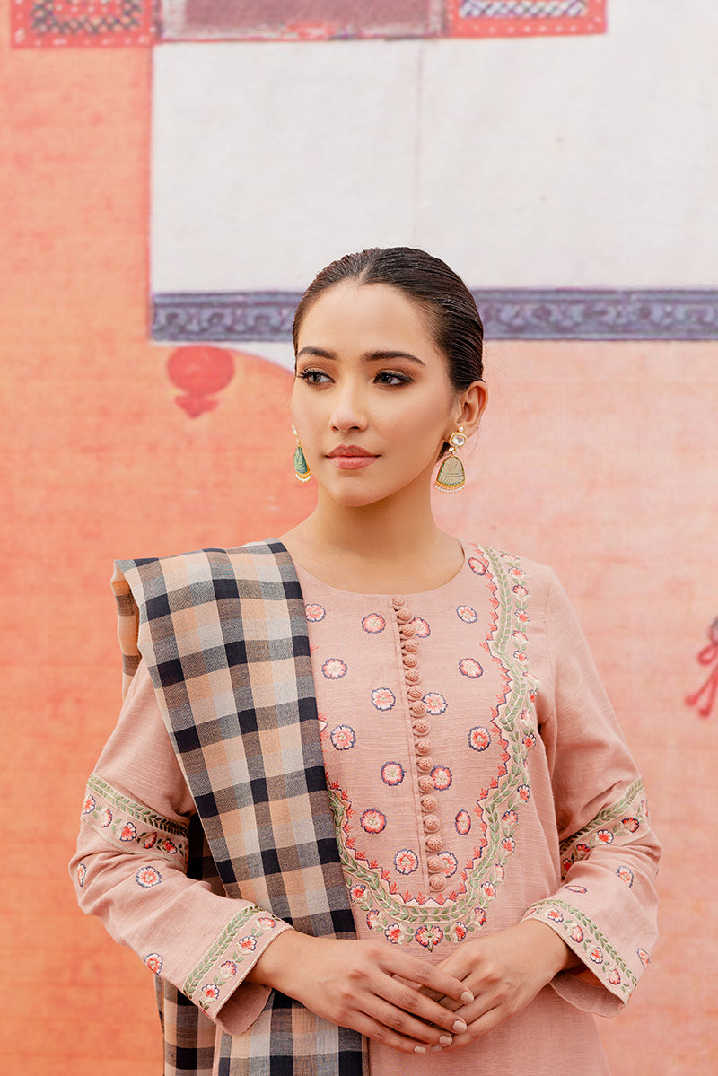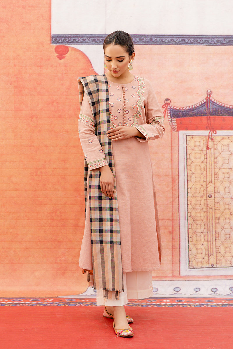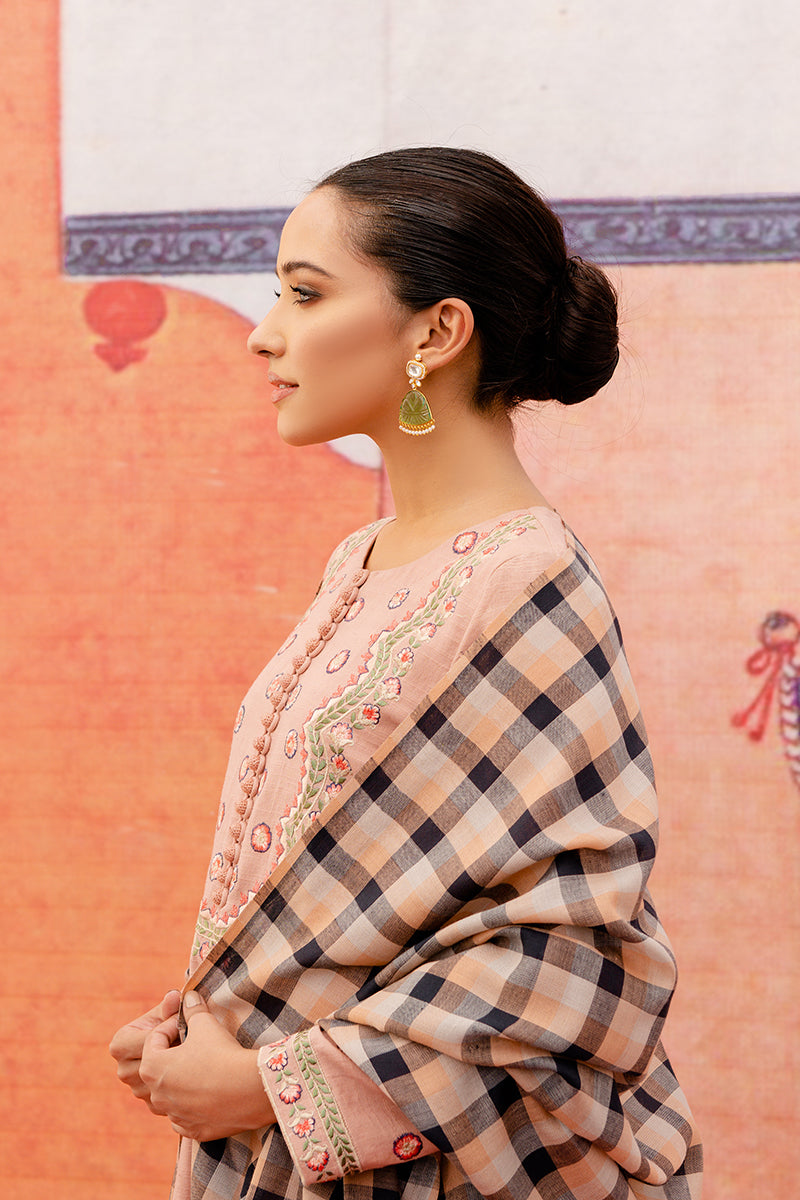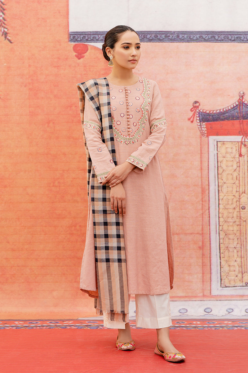 Pastel mist is a khaddar anecdote to narrate on a breezy morning. This long embellished shirt has a chequered shawl to pair up with loose trousers or churidar and a formal shoe.