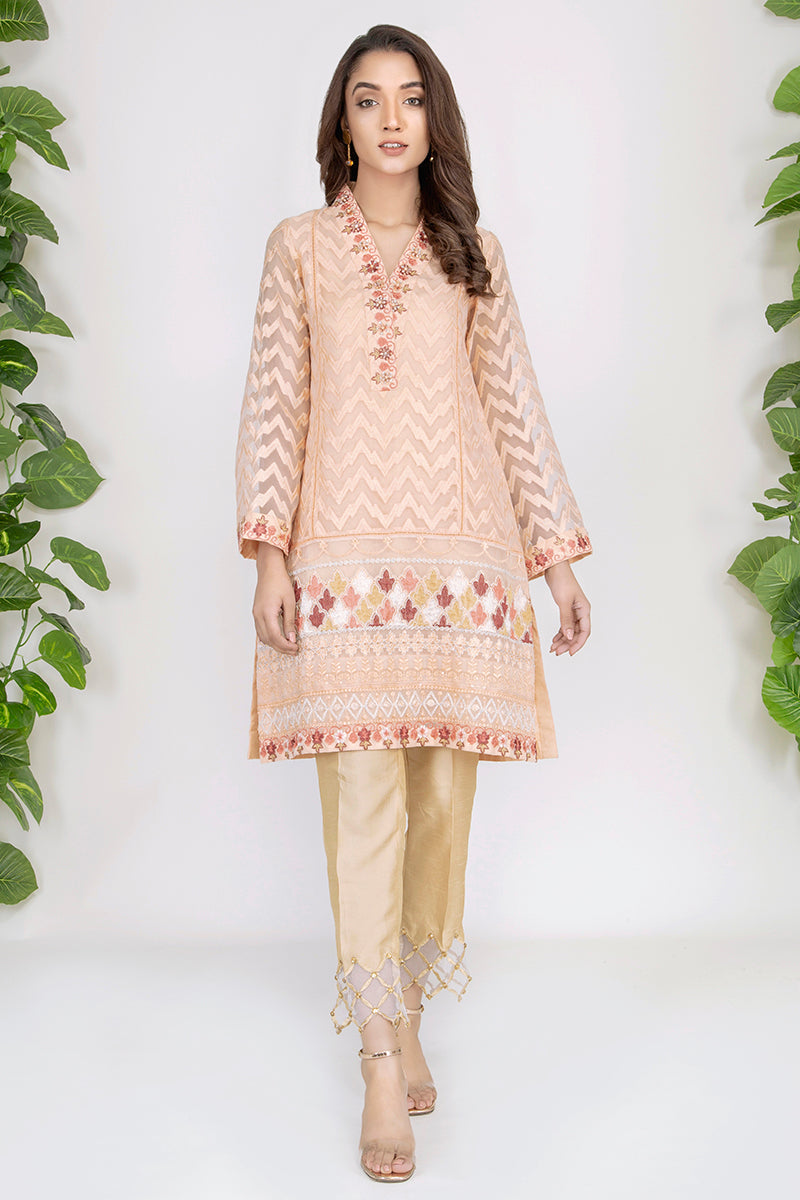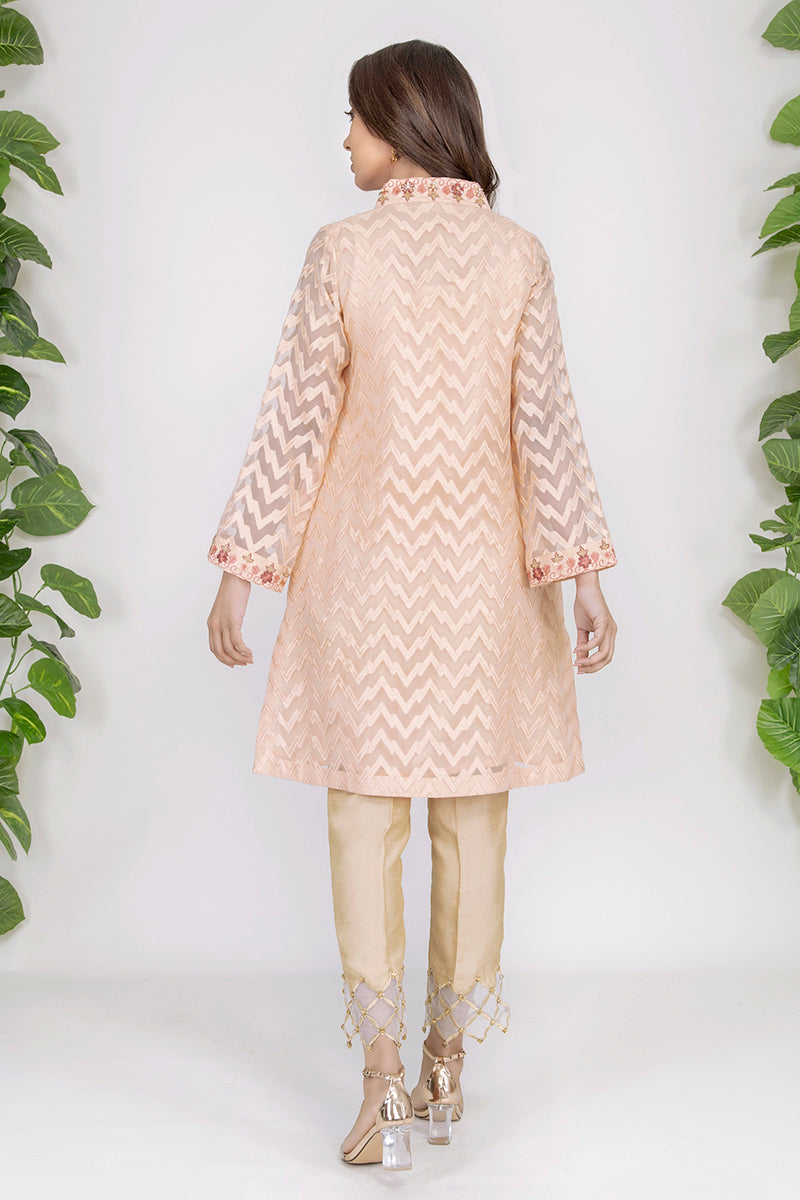 Adorned with Delicate Embellishment on Neckline, Hem, and Cuffs, This Peach Kurta is The Answer to any Intimate Occasion. Pair with a Plain Raw Silk or Embellished Bottom