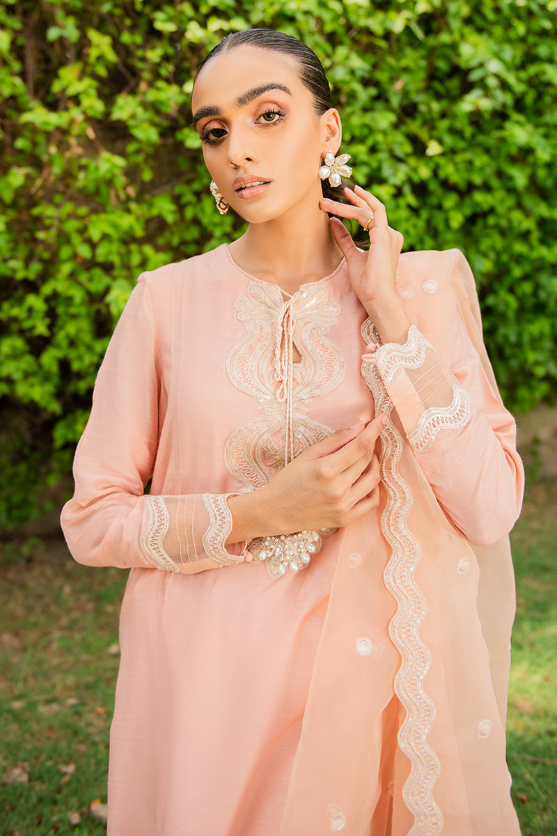 - Peach orphic comes in a divine pastel shade ornamented with an embroidered neckline and embellished tassels. The organza details on the cuffs and scalloped hemline uplifts this beautiful attire paired with a polly organza embroidered dupatta. Style with a sleek ponytail and glossy lips.
