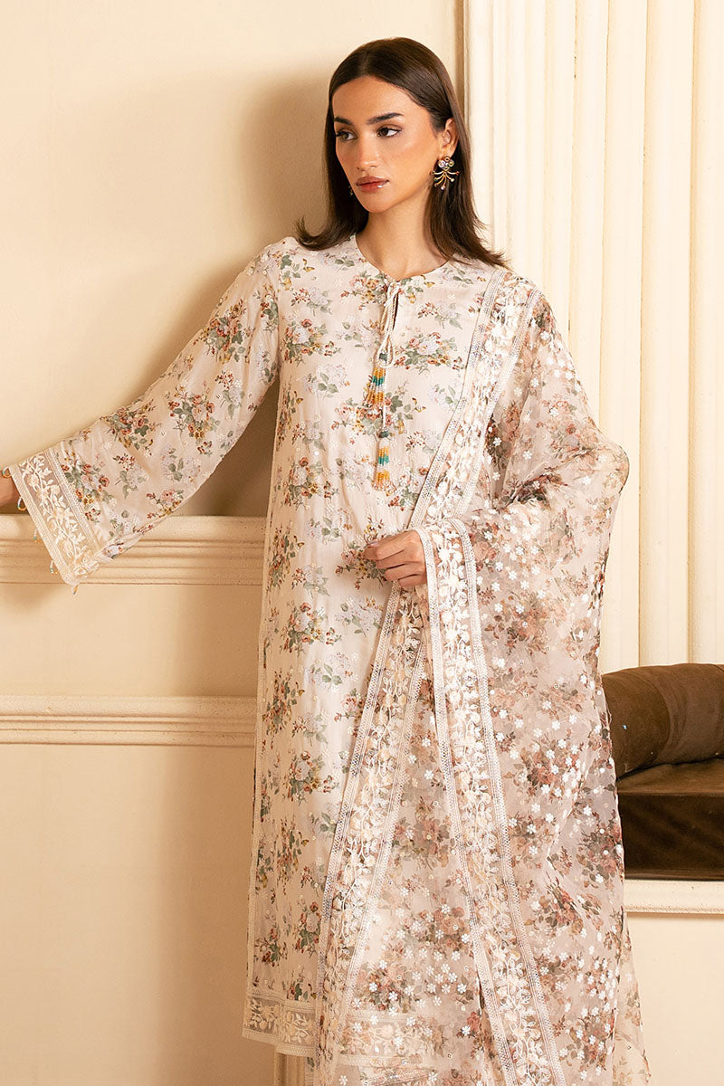 This elegant PEARL BLISS-3PC set includes a classic straight printed shirt adorned with embroidery on the hem, side slits, and sleeves in luxurious raw silk. The front features a lovely printed embroidered design with additional embroidery on the hem and slits, while the back boasts a printed Crew neck with charming tasseling detail. The sleeves also showcase a beautiful print with delicate embroidery and tasseling detail. The trousers are crafted from printed and embroidered raw silk culottes, and the set is completed with a stunning organza dupatta adorned with prints and embroidery.