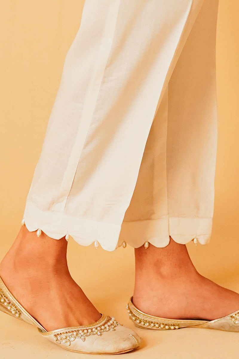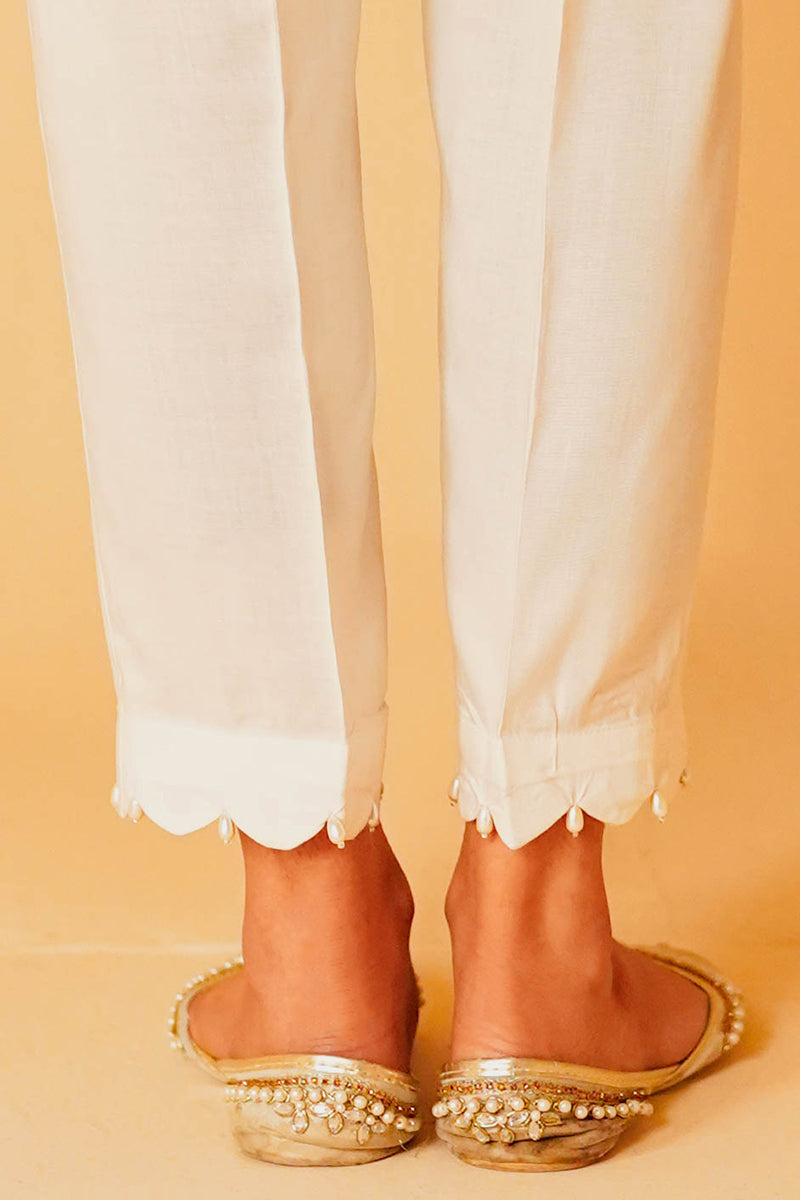 LINEN STRAIGHT FITTED PANTS SCALLOPS AND PEARL DROP