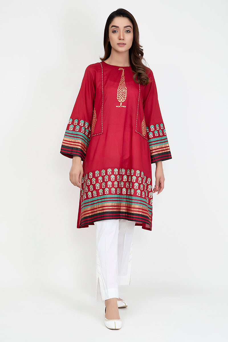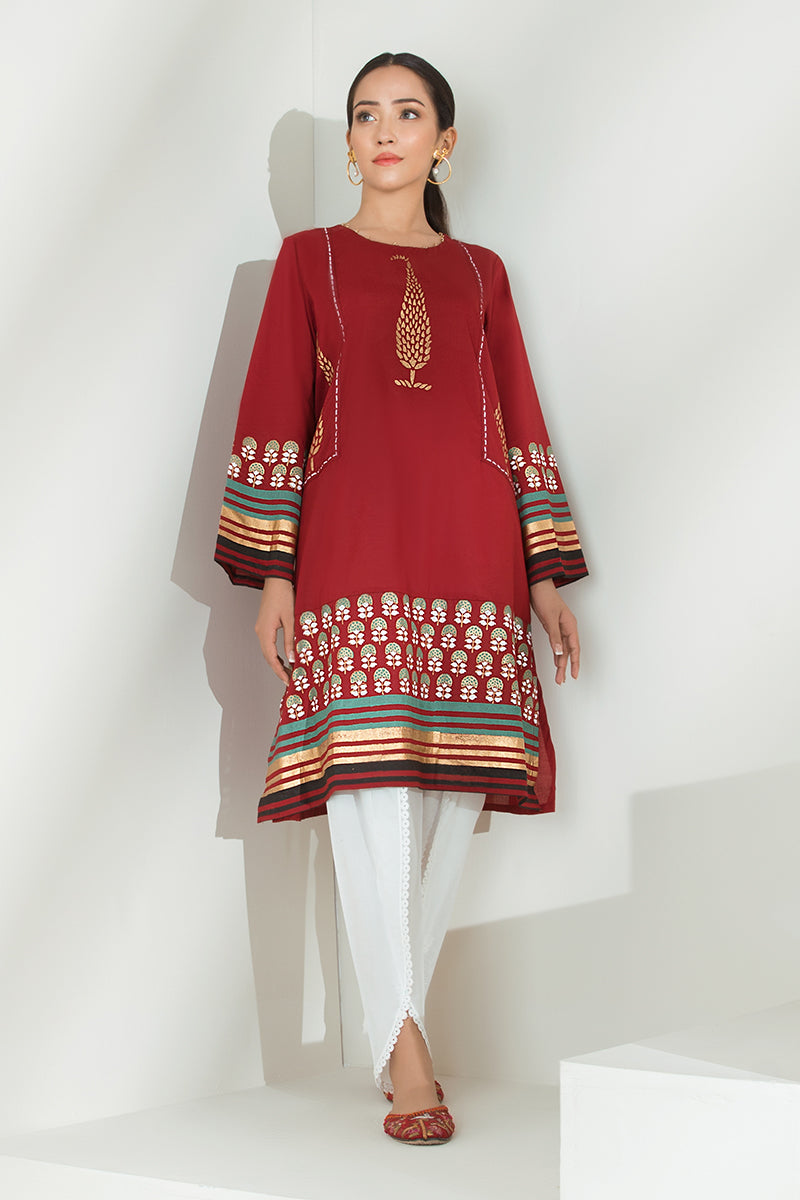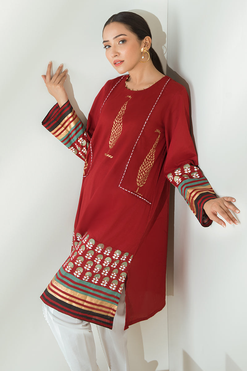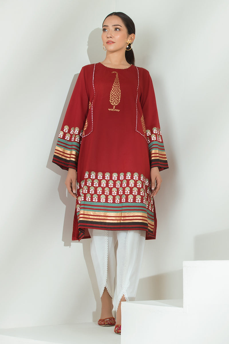 The vivacious block print border of Pine blush is a charming addition to your wardrobe. A tulip shalwar with studs pop up your look for the day.